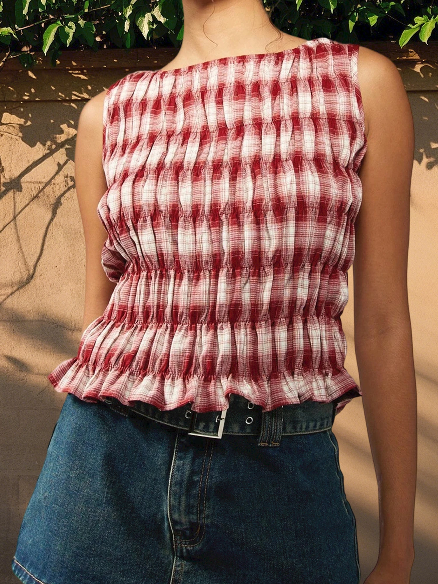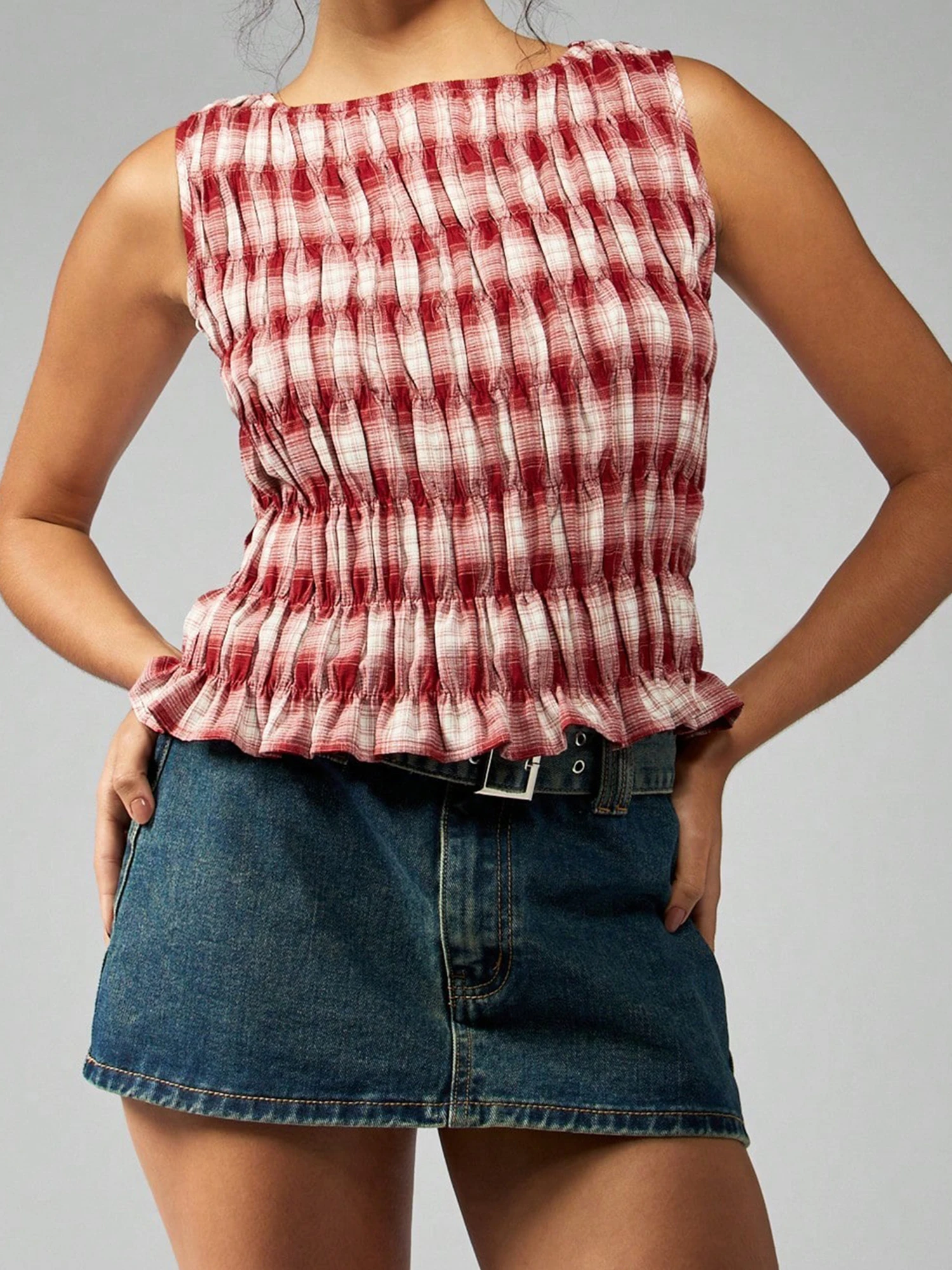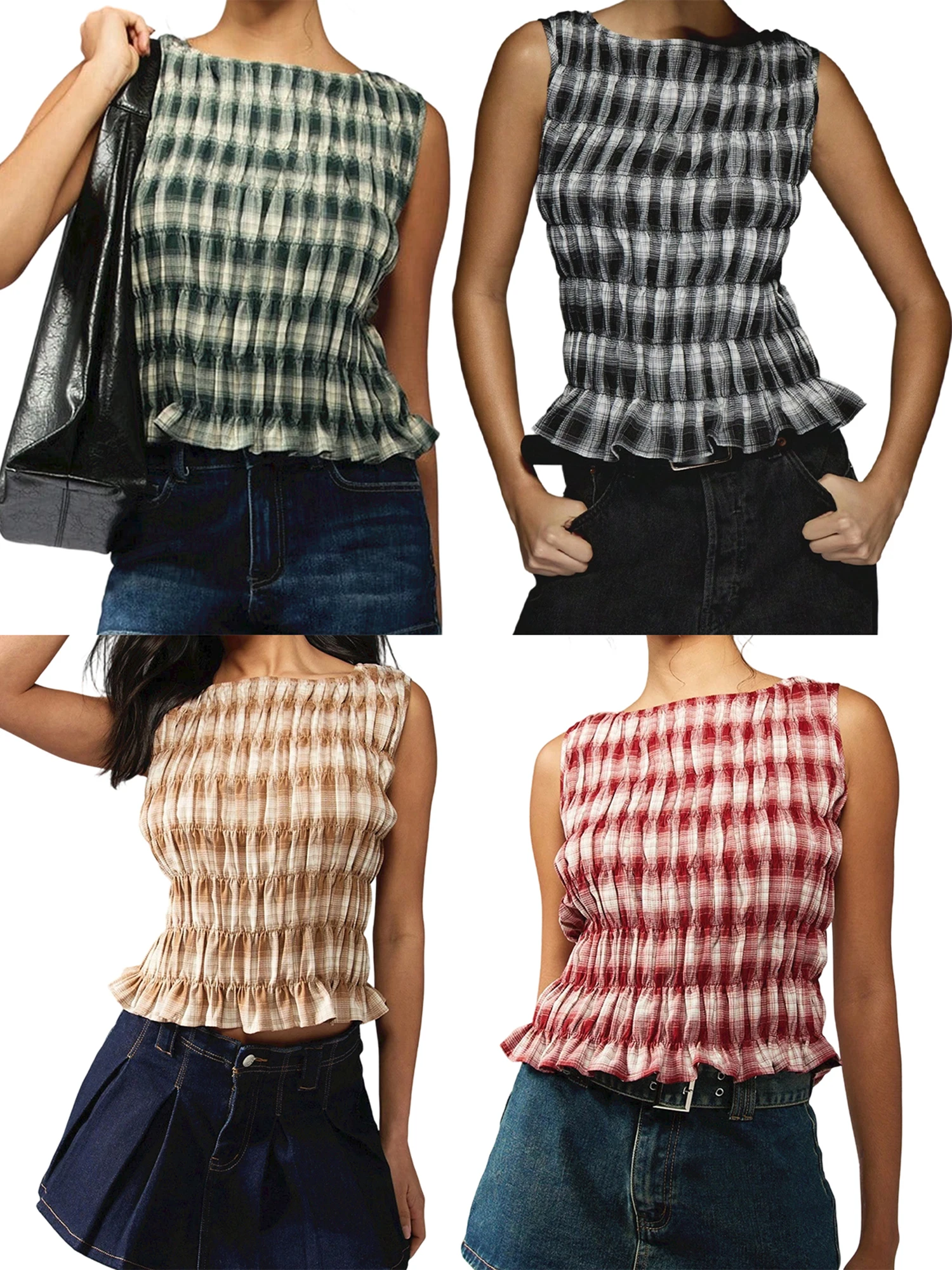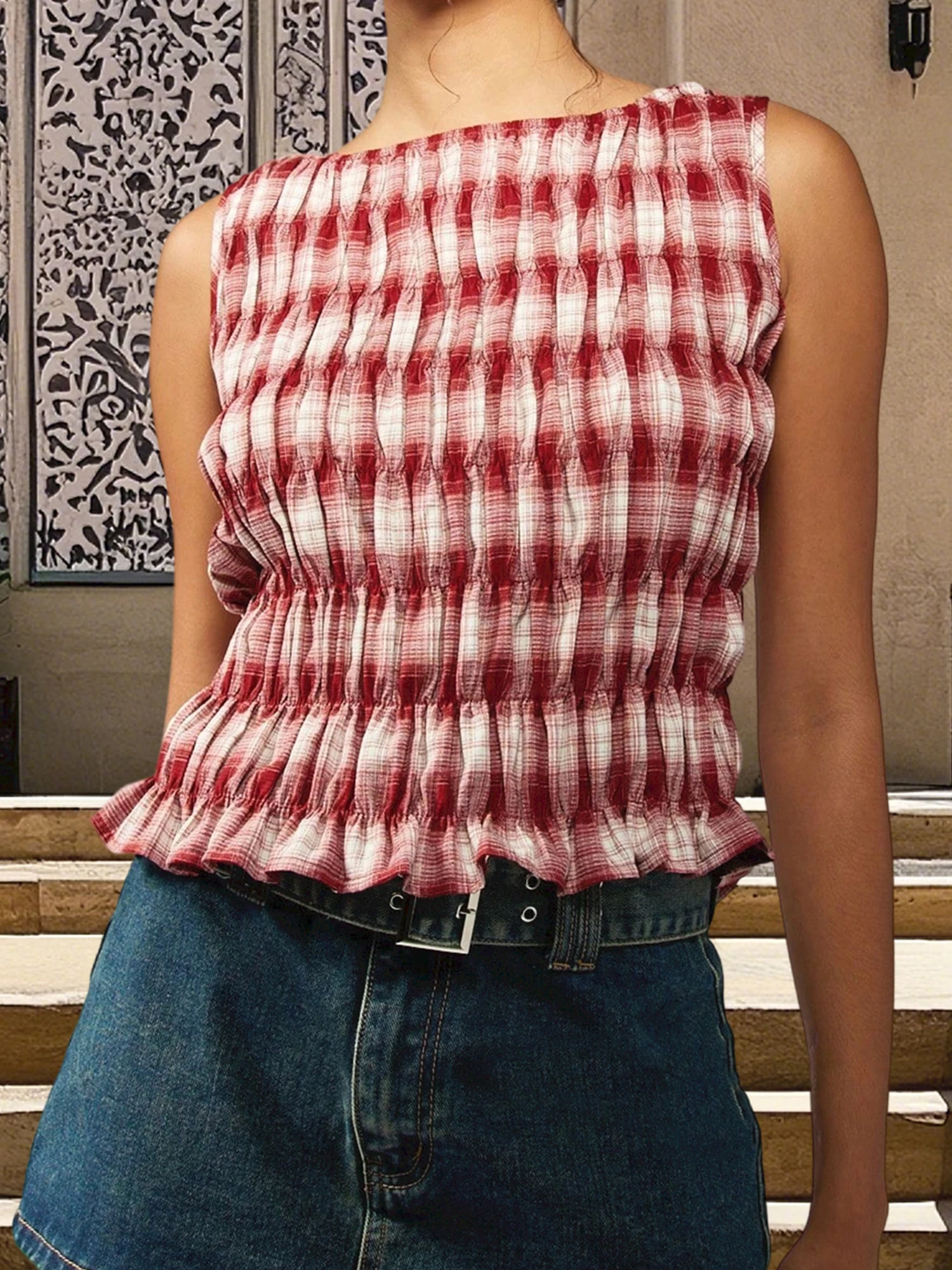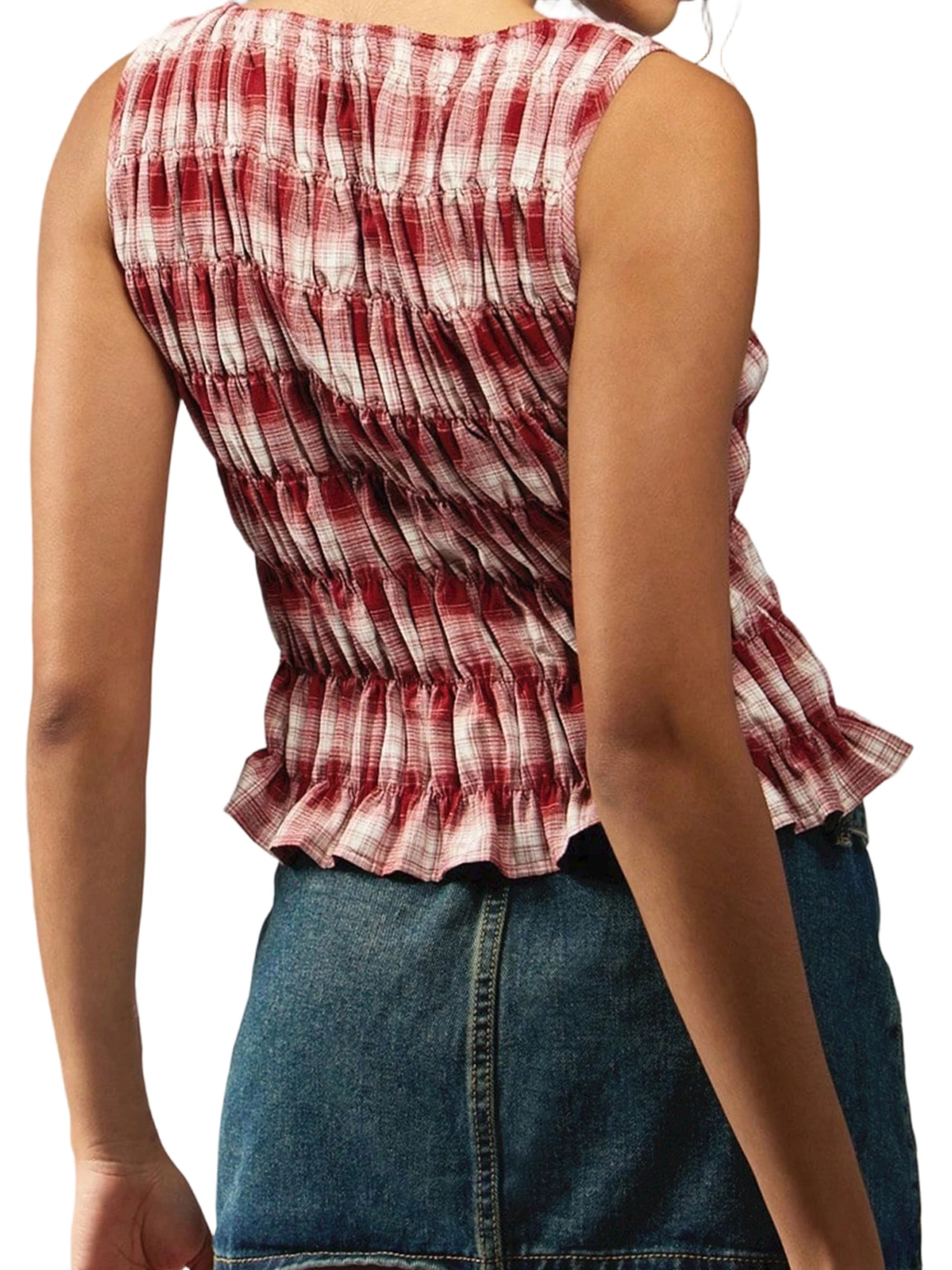 Hnewly Women Tank Tops y2k Clothes Summer Plaid Print Crew Neck Sleeveless Pleated T Shirts Vest Streetwear for Casual Daily