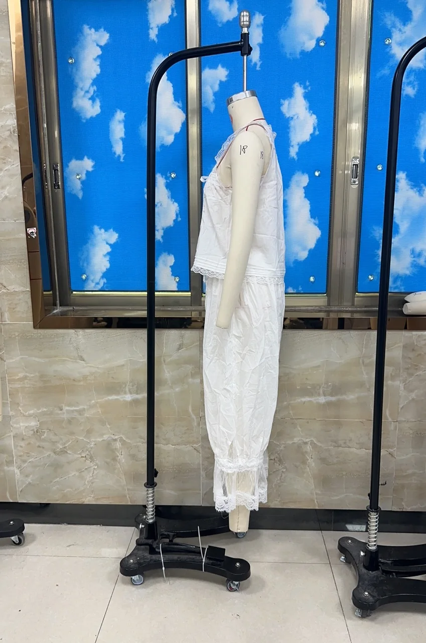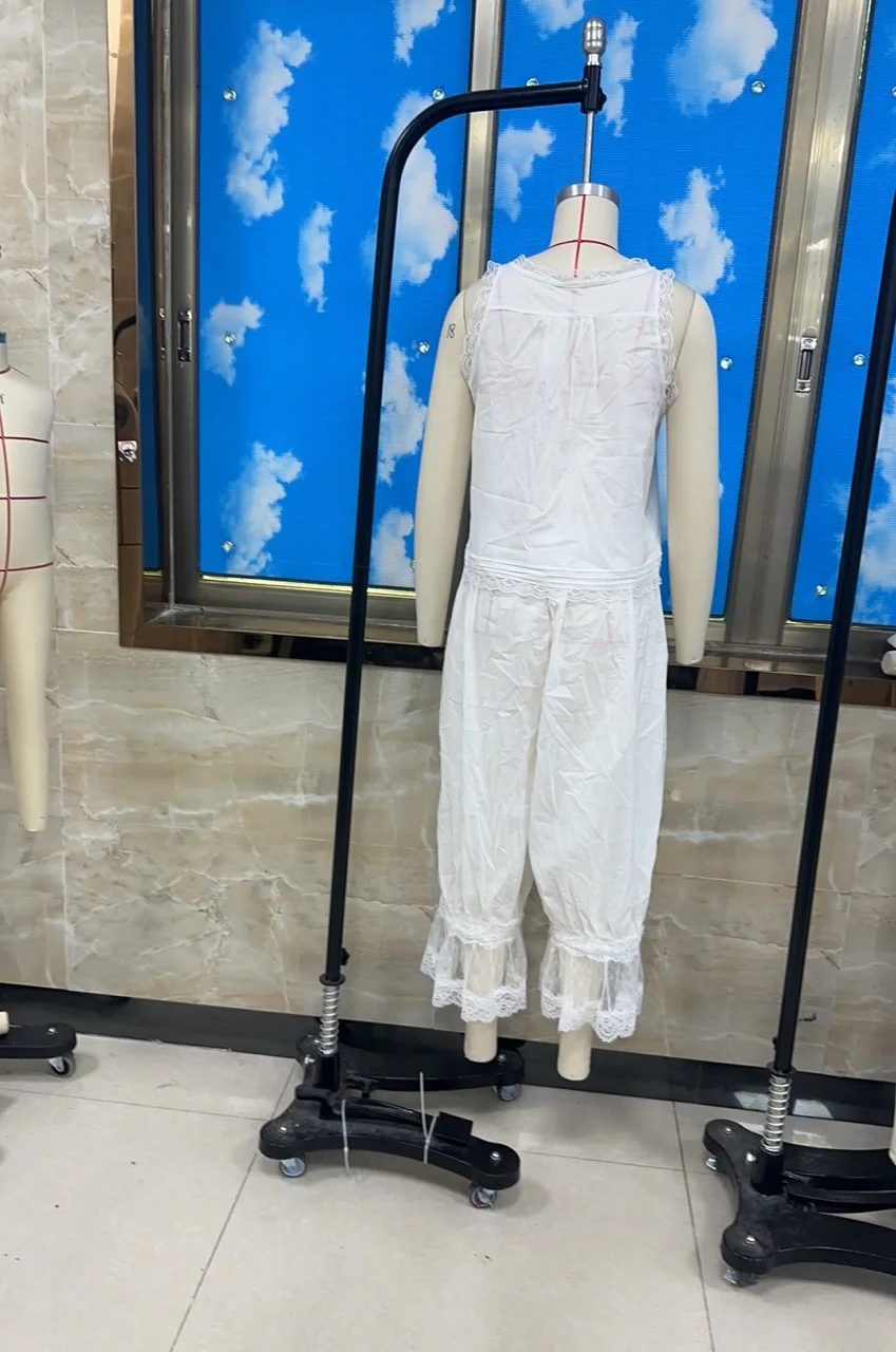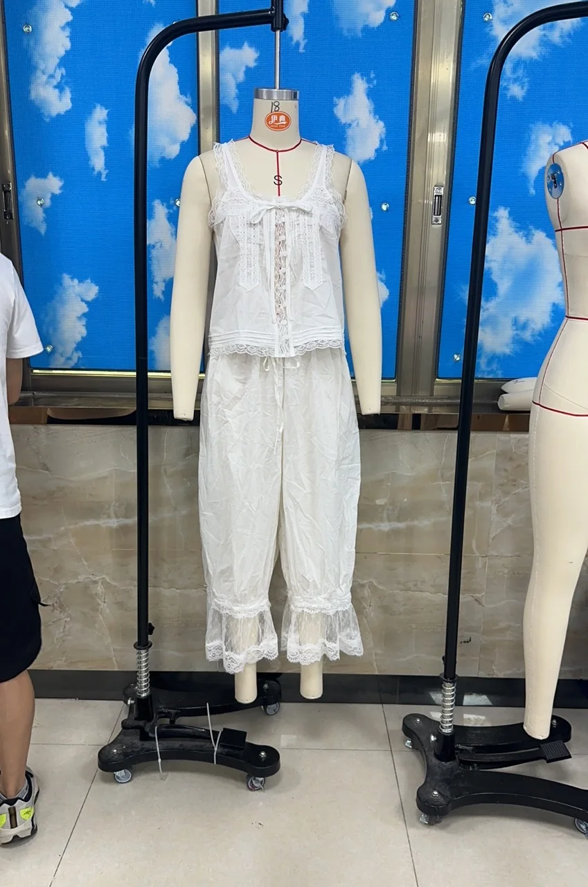 Hnewly Women's Boho Vintage 2 Piece Pants Outfit Summer Casual Sleeveless Tie Front Lace Trim Tank Tops Drawstring Pants Sets