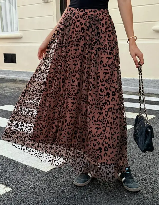 Hnewly Women's Casual Fashion Maxi Skirt Leopard Print Detail with Sheer Chiffon and Flowy Fit Suitable for Daily and Street Wear
