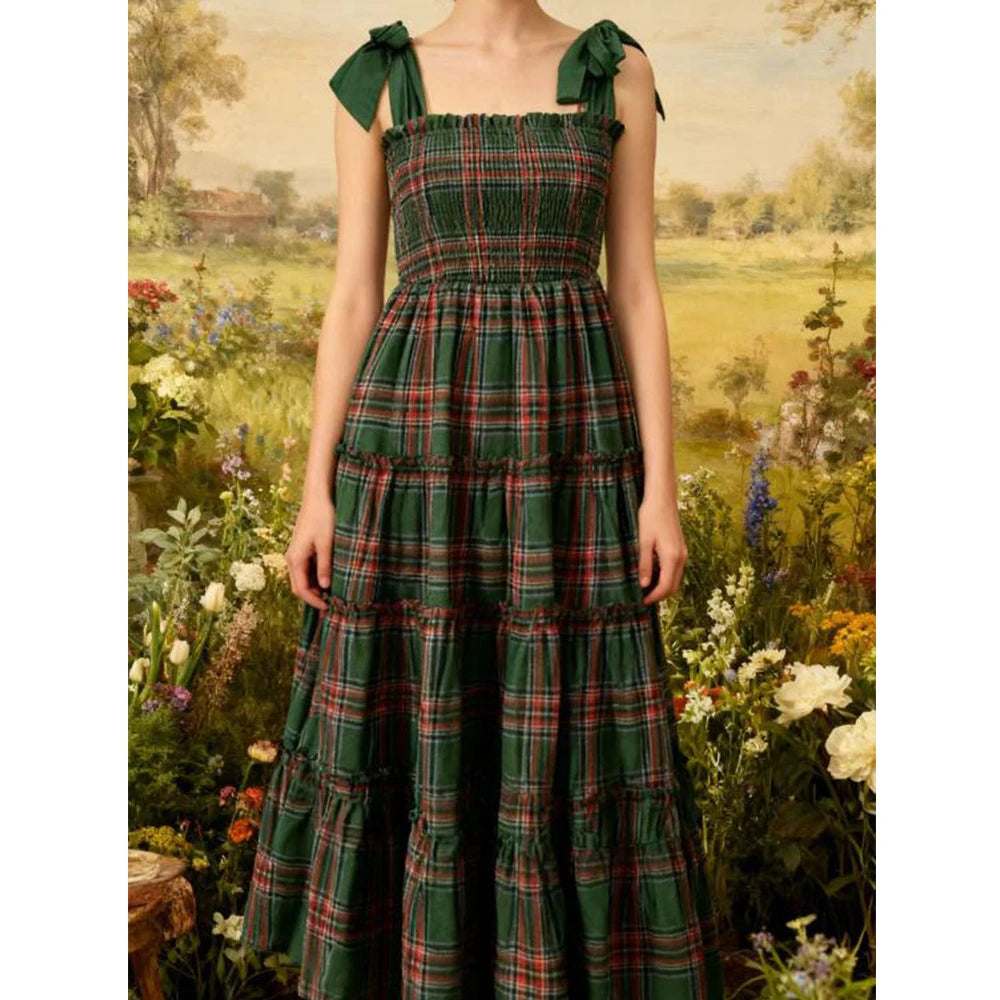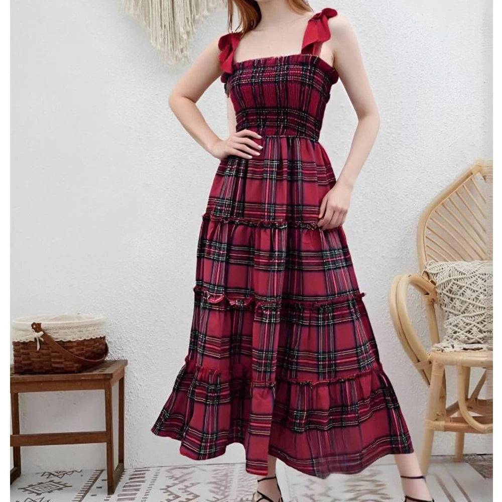 Hnewly Women's Christmas Red Plaid Print Aesthetic Long Dress Elegant Flowy A Line Ruffle Dresses Cute Xmas Holiday Party Dress