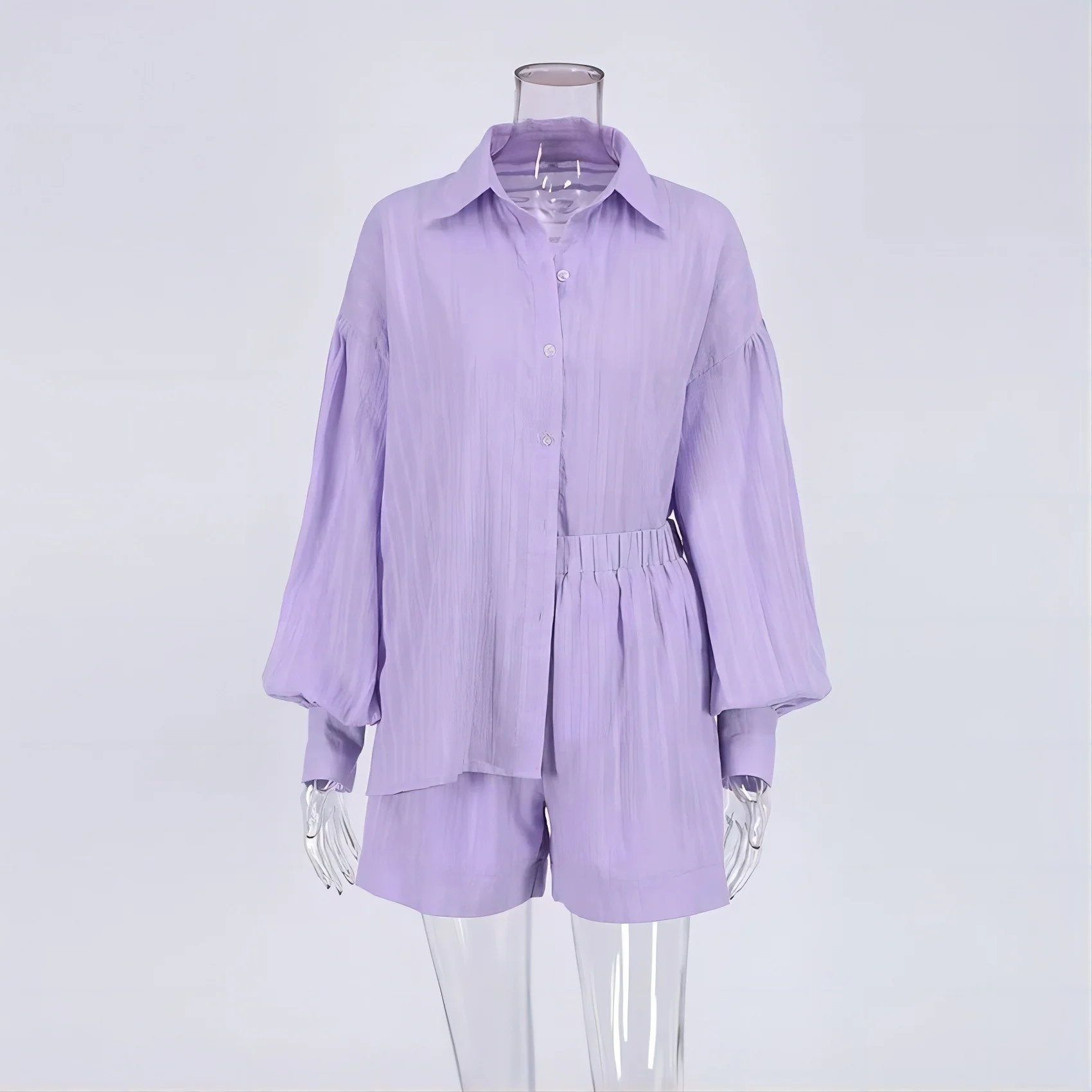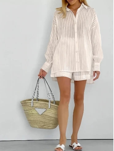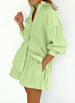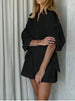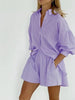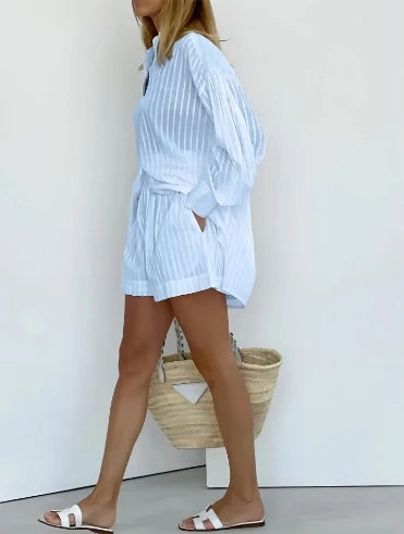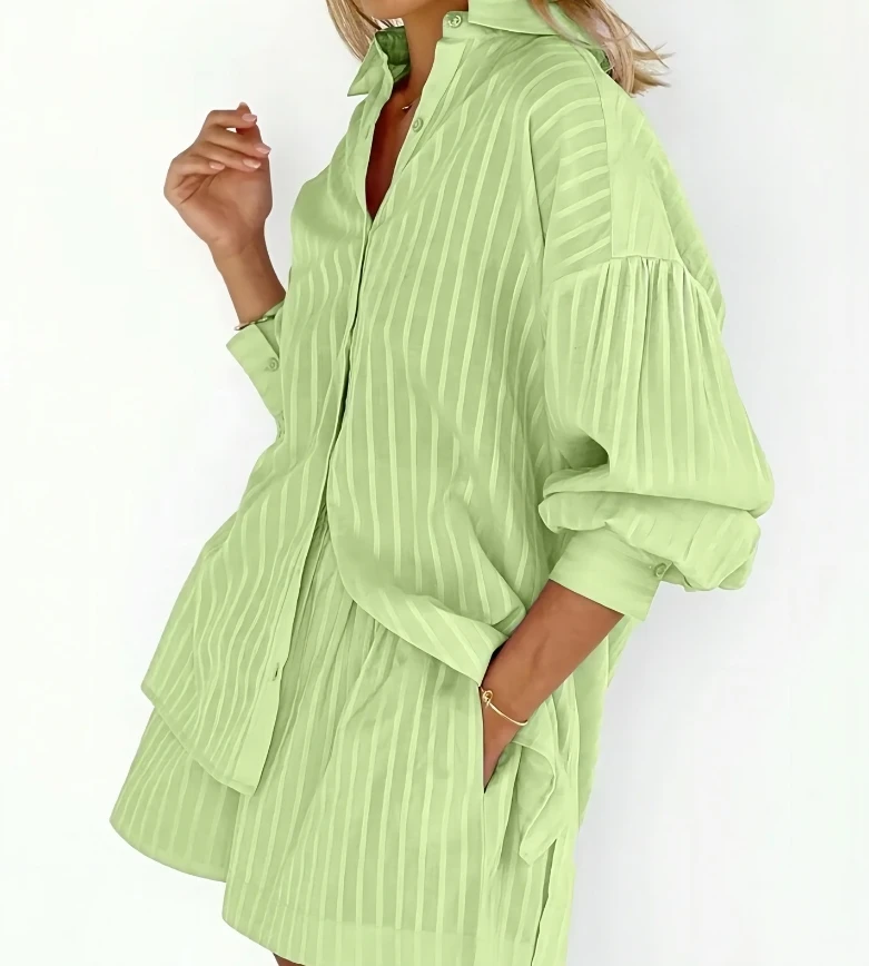 Hnewly Women's Fashion Two Piece Sets Outfit Striped Bubble Sleeve Shirt +Shorts Commuting Design Casual Set