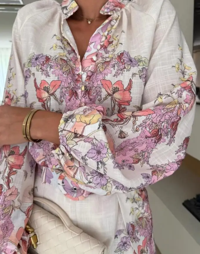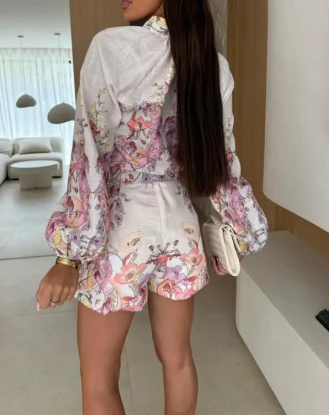 Hnewly Women's Fashionable Two - Piece Set, A Floral Print Button - Front Blouse Combined with Shorts, Completed with a Belt Detail.