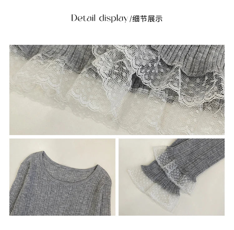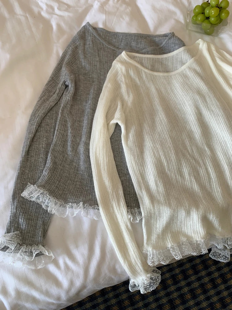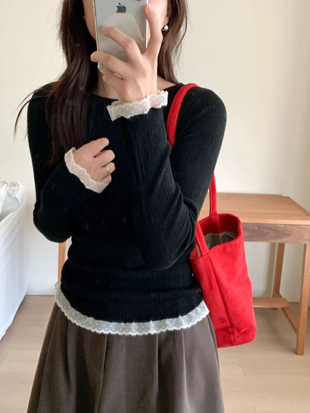 Hnewly Women's Ribbed Knit Top with Lace Trim Long Sleeve O-neck Stretchy Fitted Shirt Pullovers Sweater Teen-girl Basic Outfit