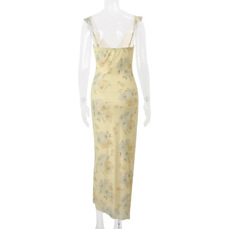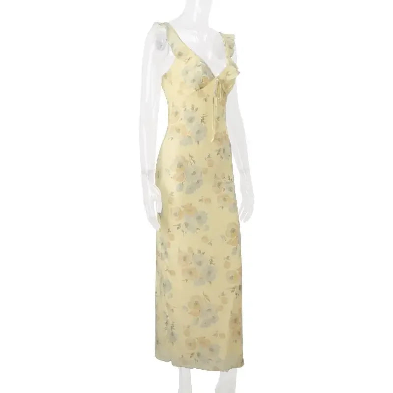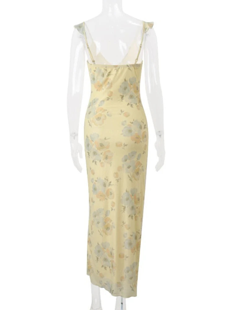 Hnewly Women's Ruffles Mesh Dresses Beach Vacation Sexy Low-cut Dress Flower Printed Elegant Sleeveless Backless Yellow Dress