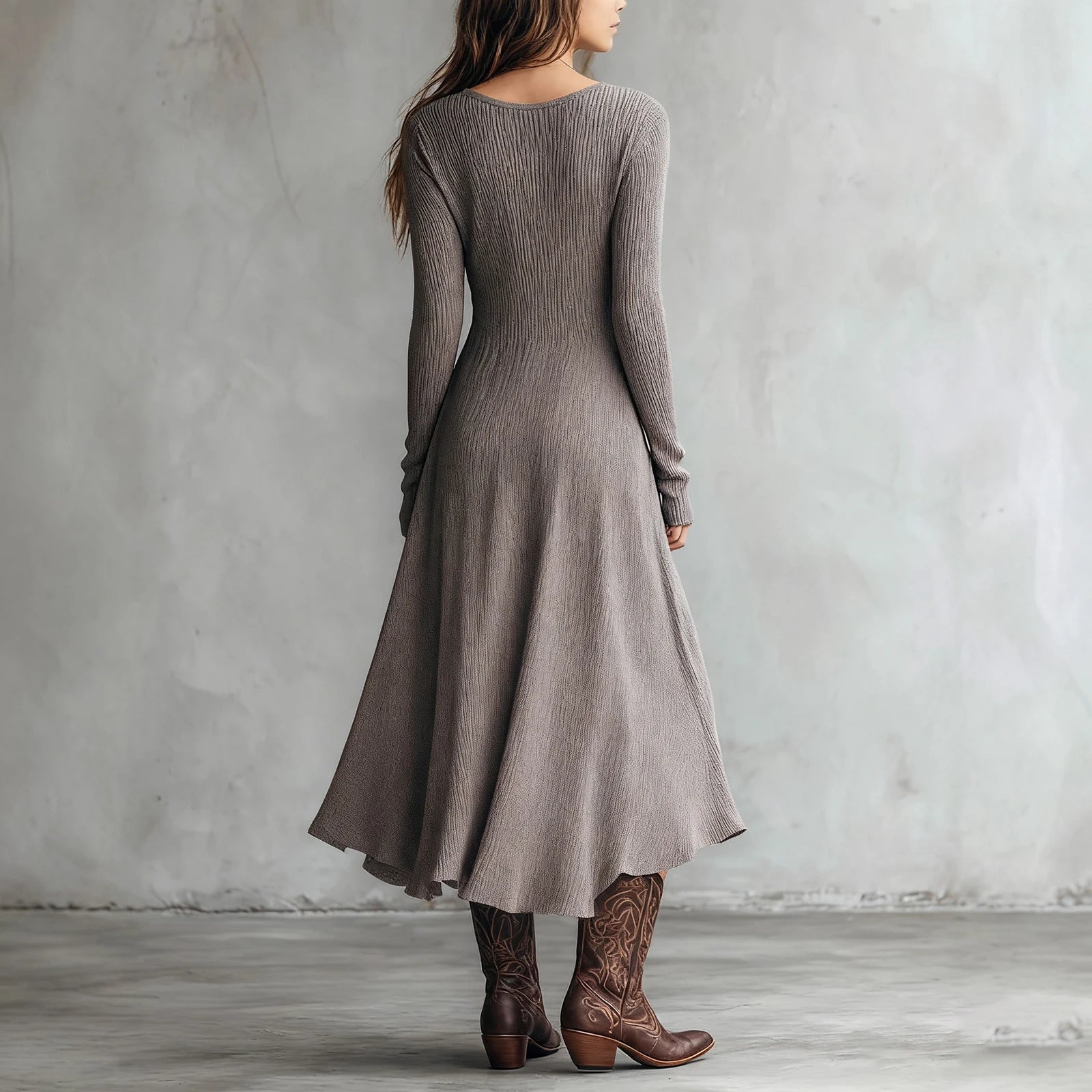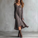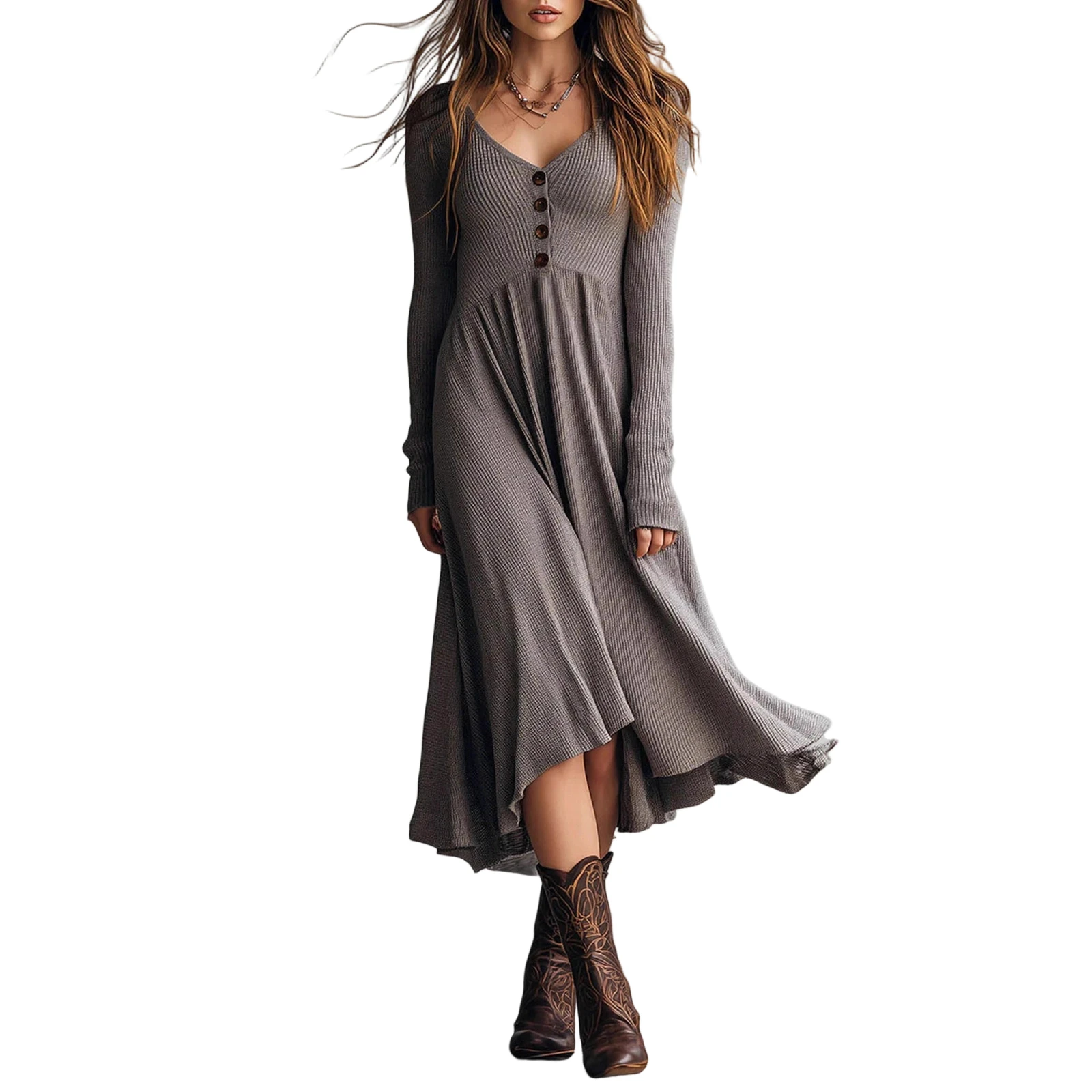 Hnewly Women's Simple Basic Lightweight Long Sleeve V-neck Long Dress Fashion Korean Style Daily Elastic Soft and Comfortable Skirt
