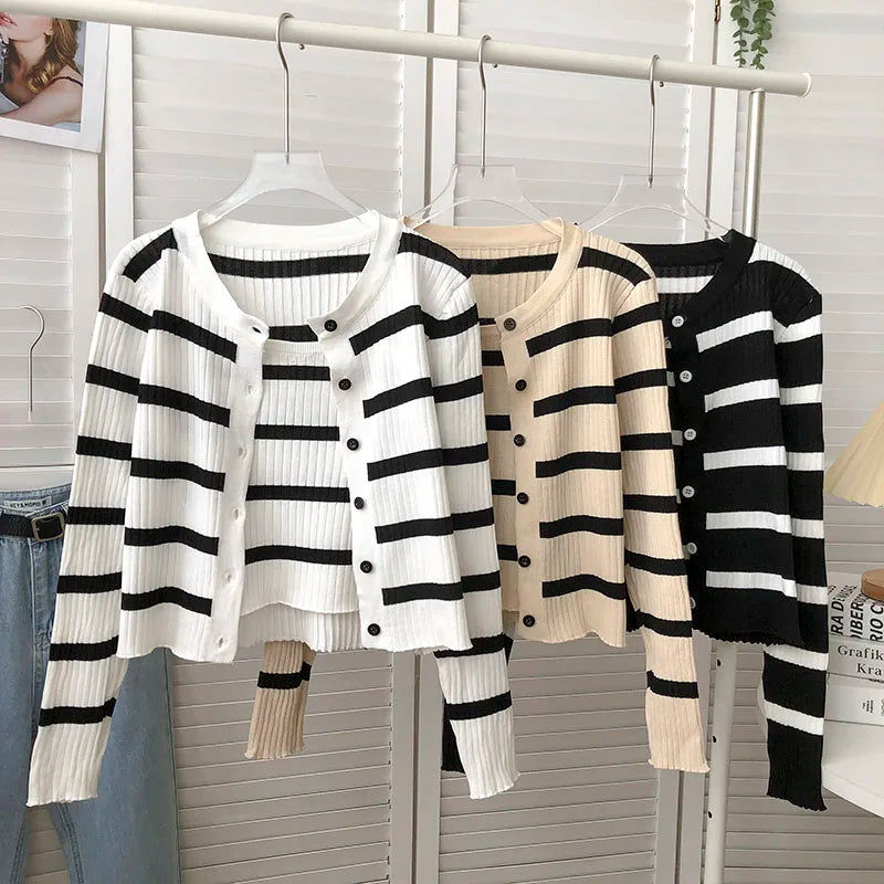 Hnewly Women's Striped Knitting Cardigan Single Breasted Long Sleeved Sweater+Spaghetti Straps Vest Spring Autumn Korean Top 2pcs
