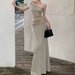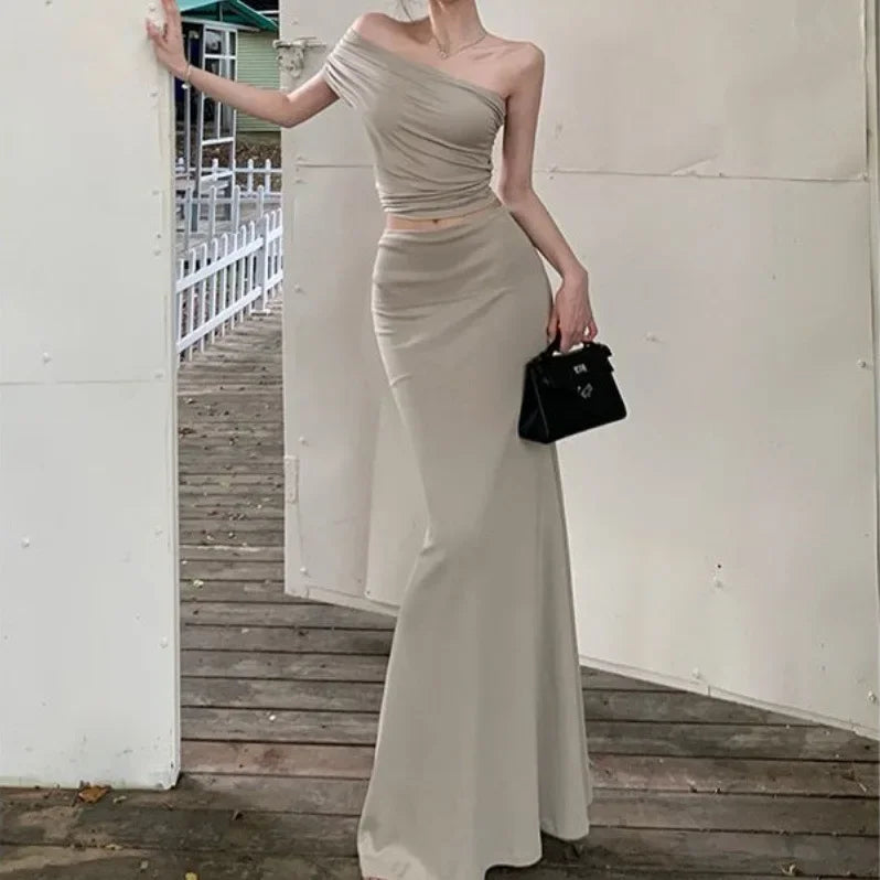 Hnewly Women's Summer One Shoulder Pleated Slimming Top, Slim Fit Half Skirt, Long Skirt Two-Piece Set