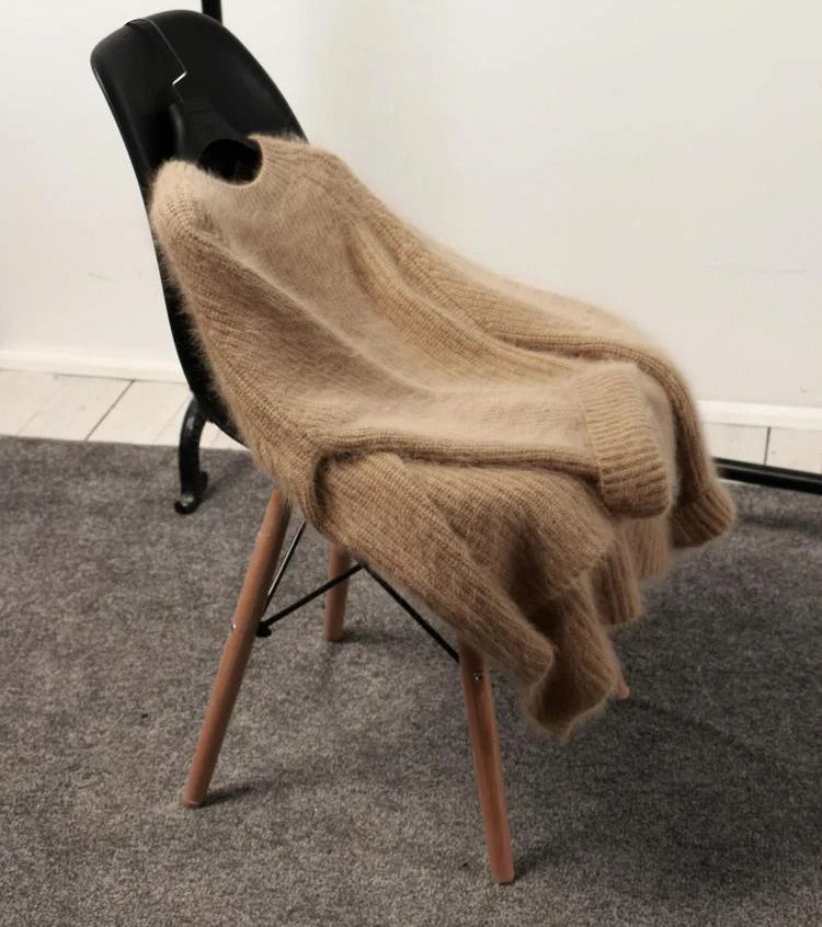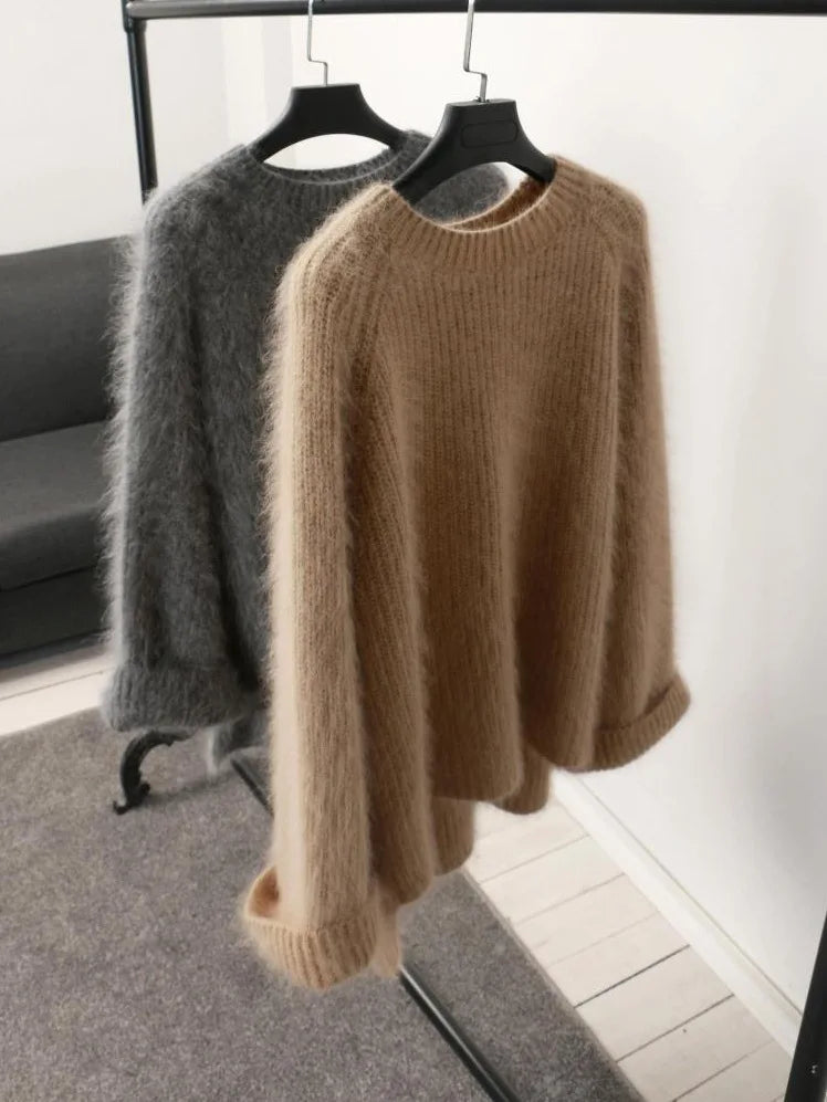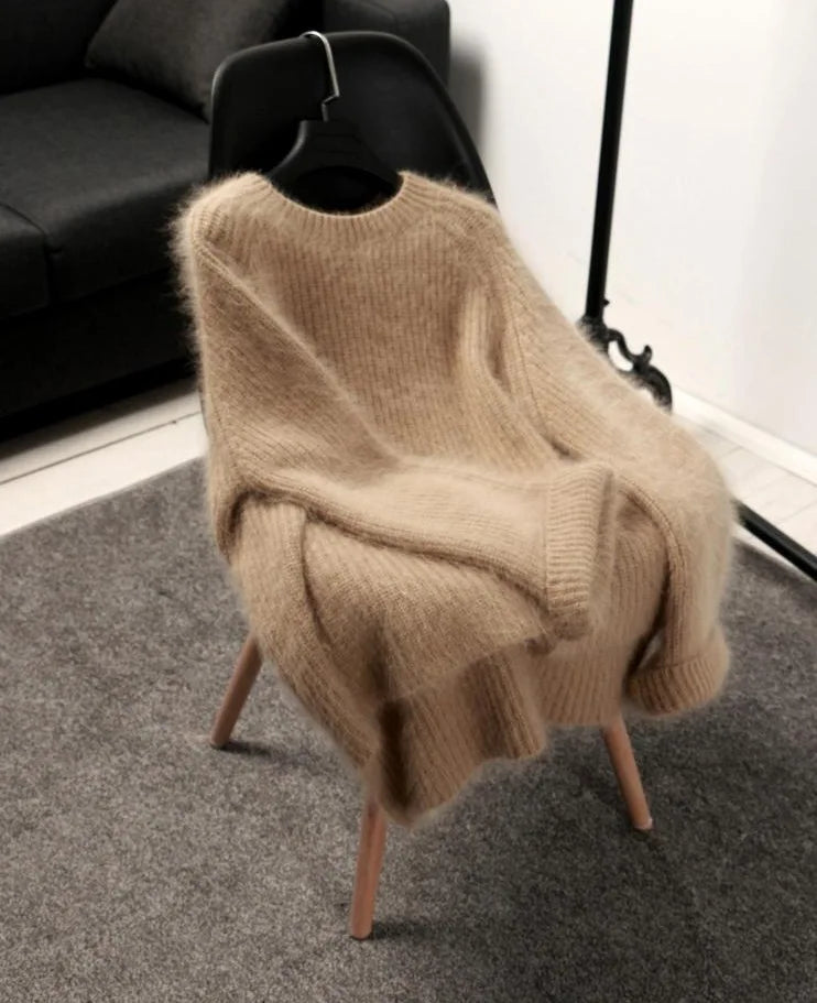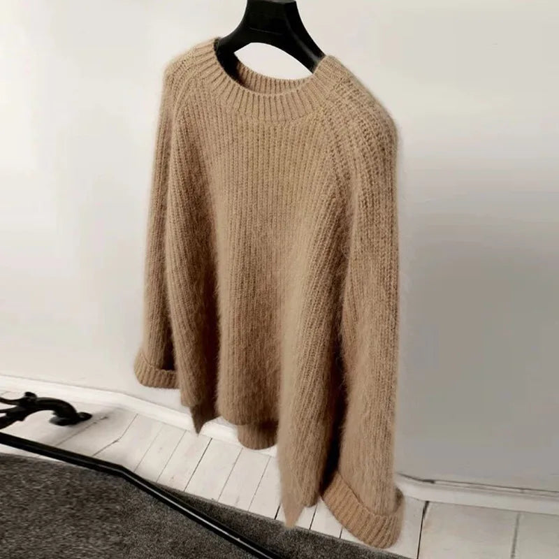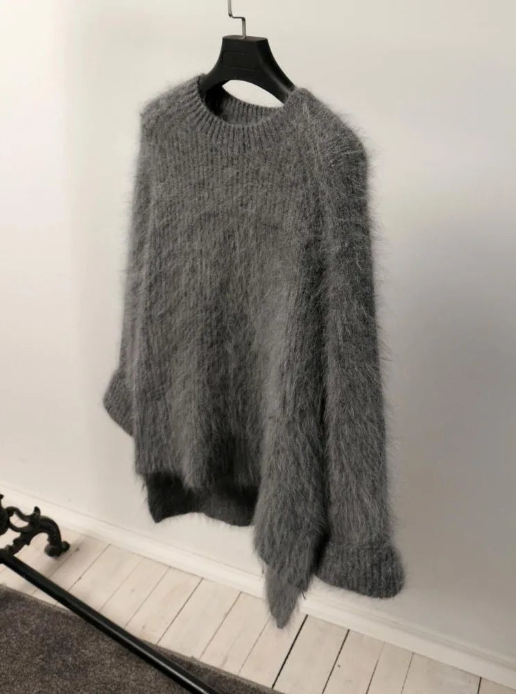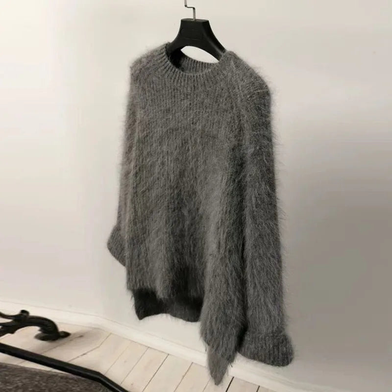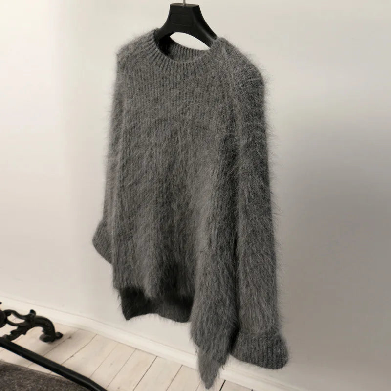 Hnewly Women's Thickened O-Neck Mohair Pullover Sweater New Winter Pure Color Female Loose Knitwear Long Sleeve Asymmetry Knit Top