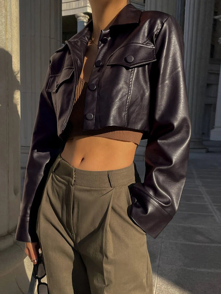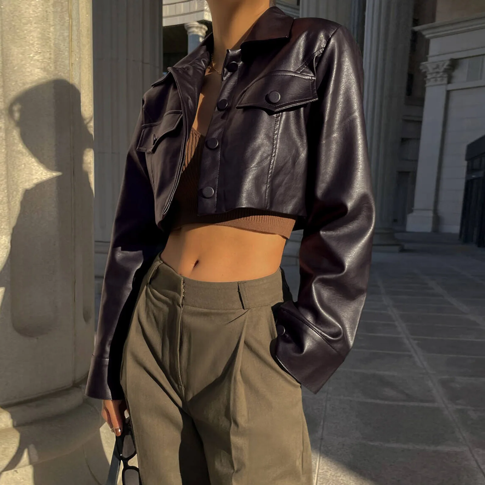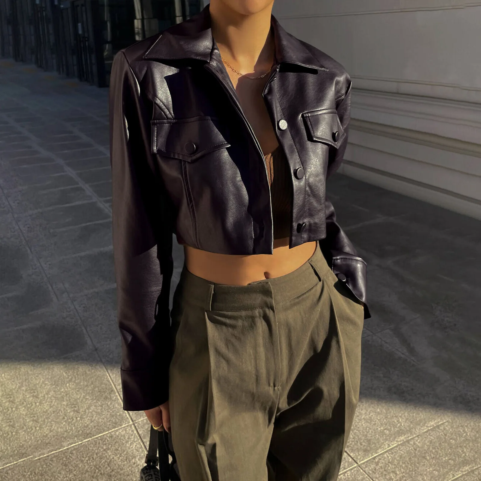 Hnewly Women's Y2K Short Jacket Faux Leather Turn-down Collar Button Decorated PU Grunge Street Casual Fashion Coat