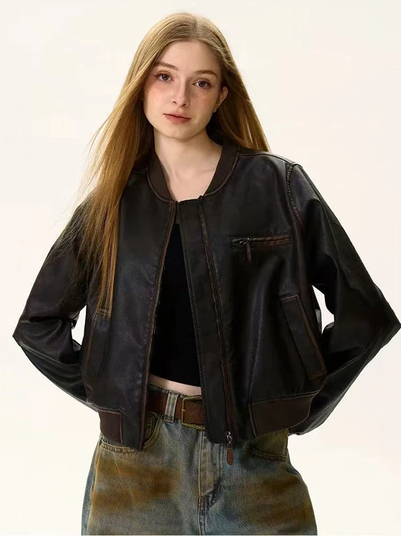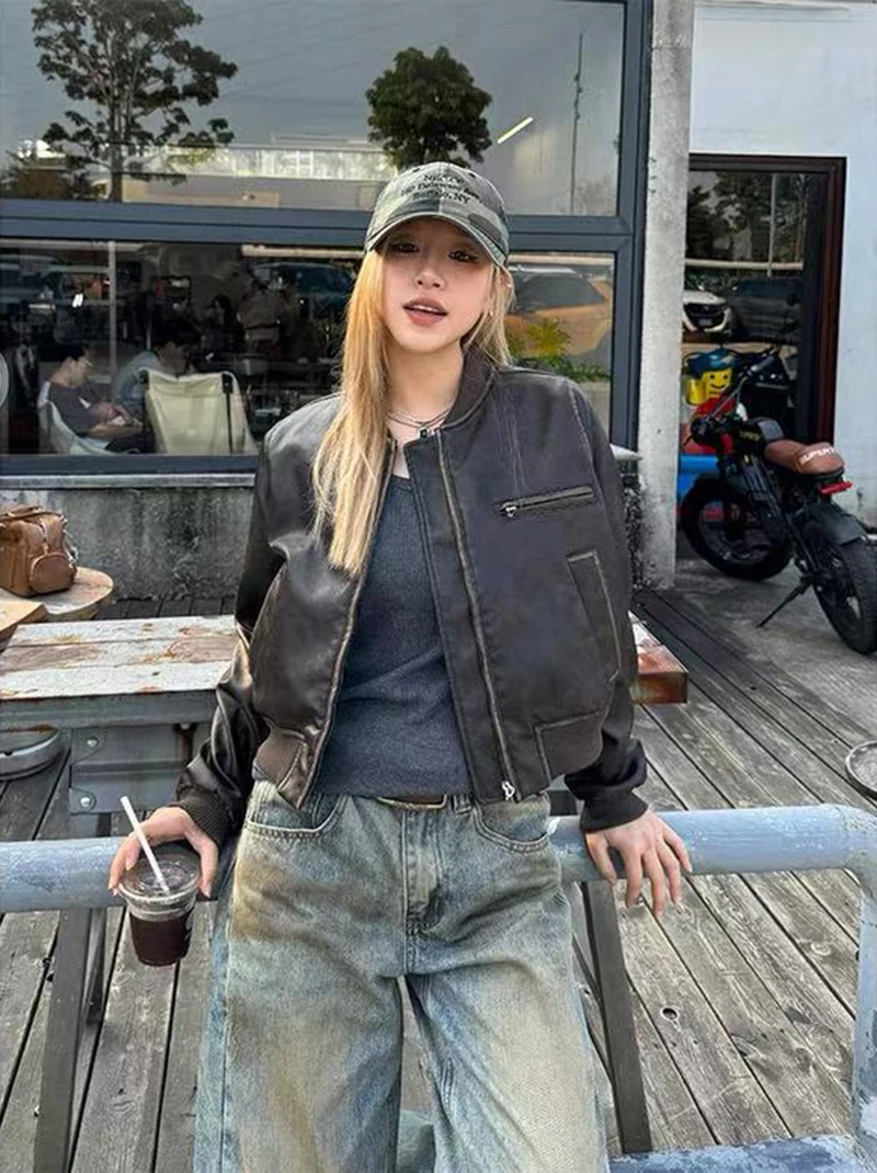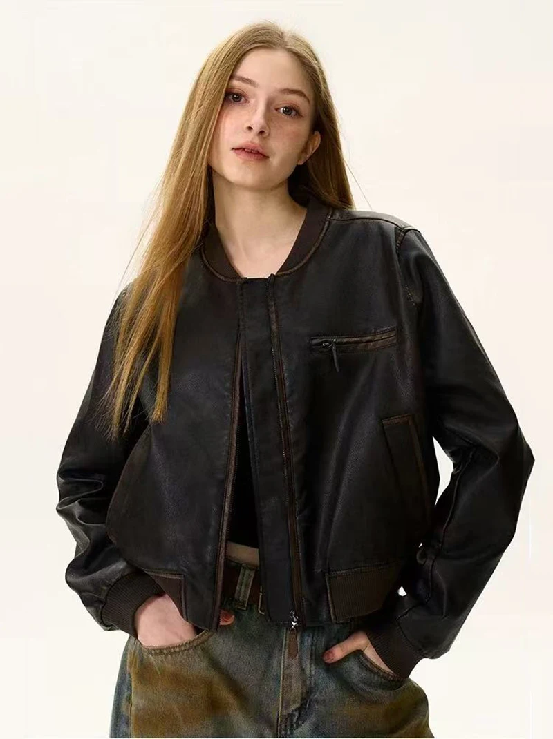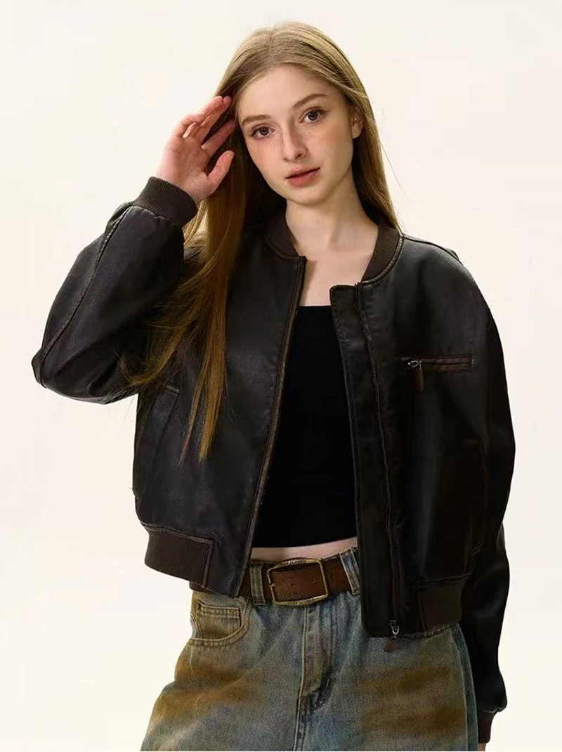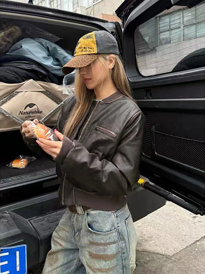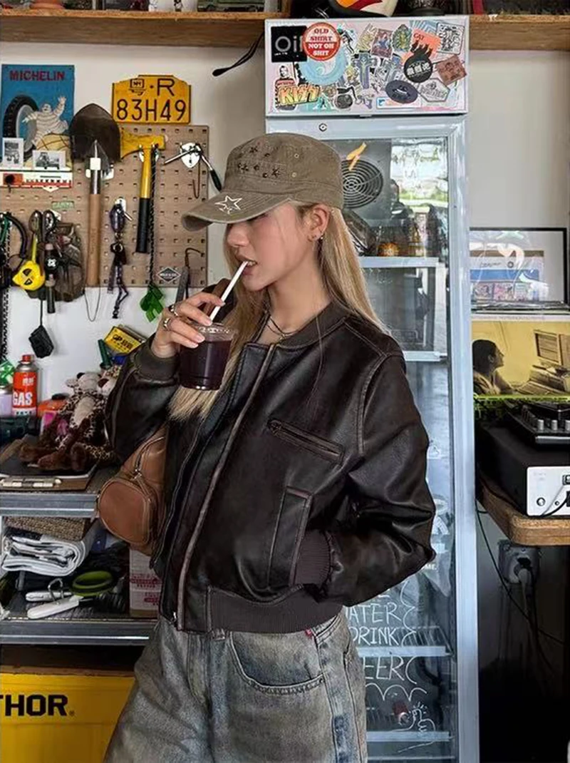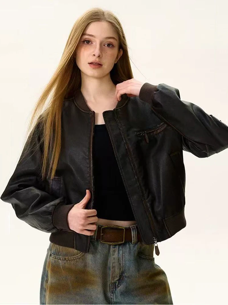 Hnewly Y2K American Pu Leather Women Jacket Y2K Brown Vintage Long Sleeve Stand Collar Crop Coats Hip Hop Streetwear Zipper Outerwear