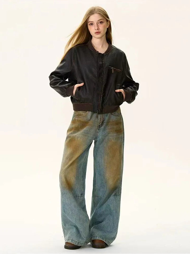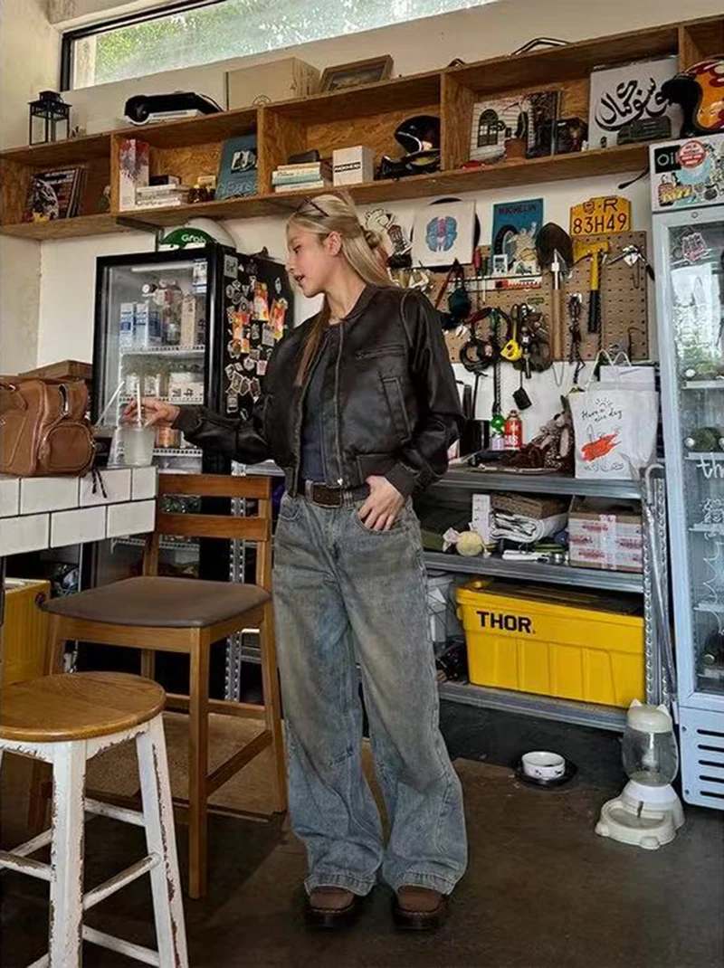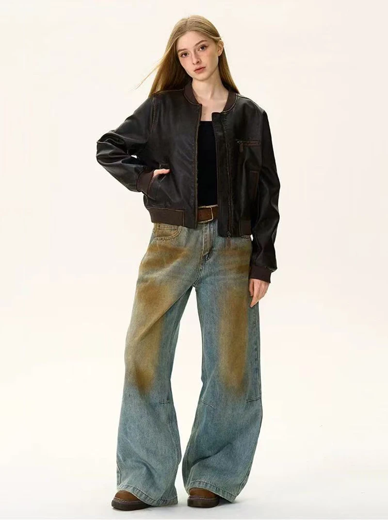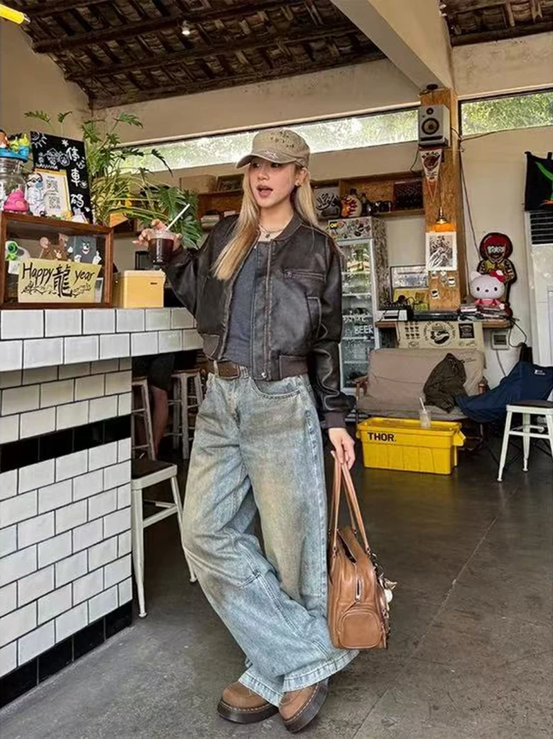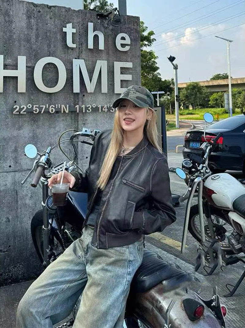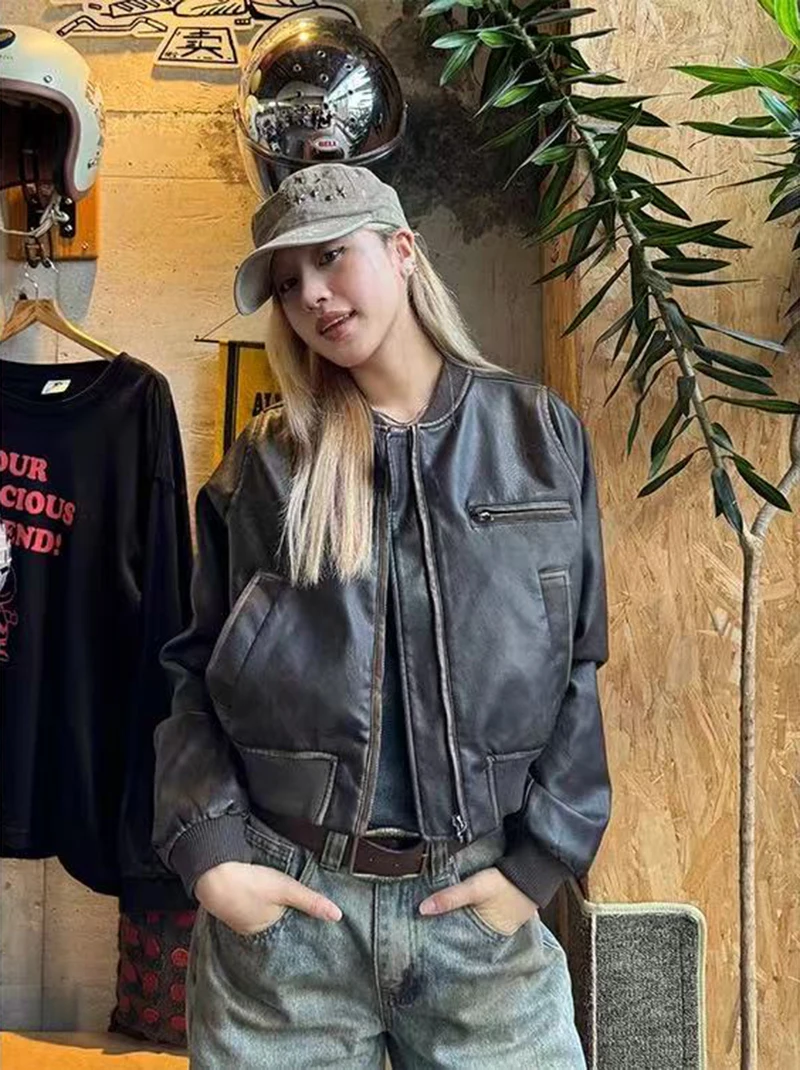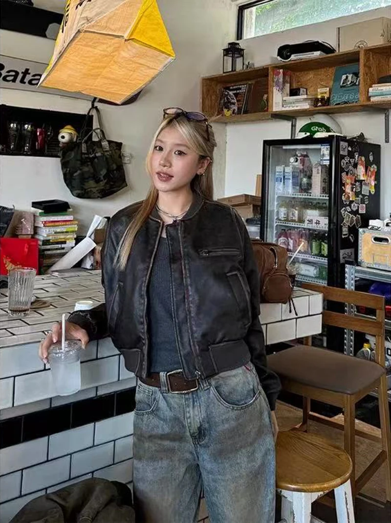 Hnewly Y2K American Pu Leather Women Jacket Y2K Brown Vintage Long Sleeve Stand Collar Crop Coats Hip Hop Streetwear Zipper Outerwear
