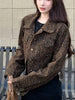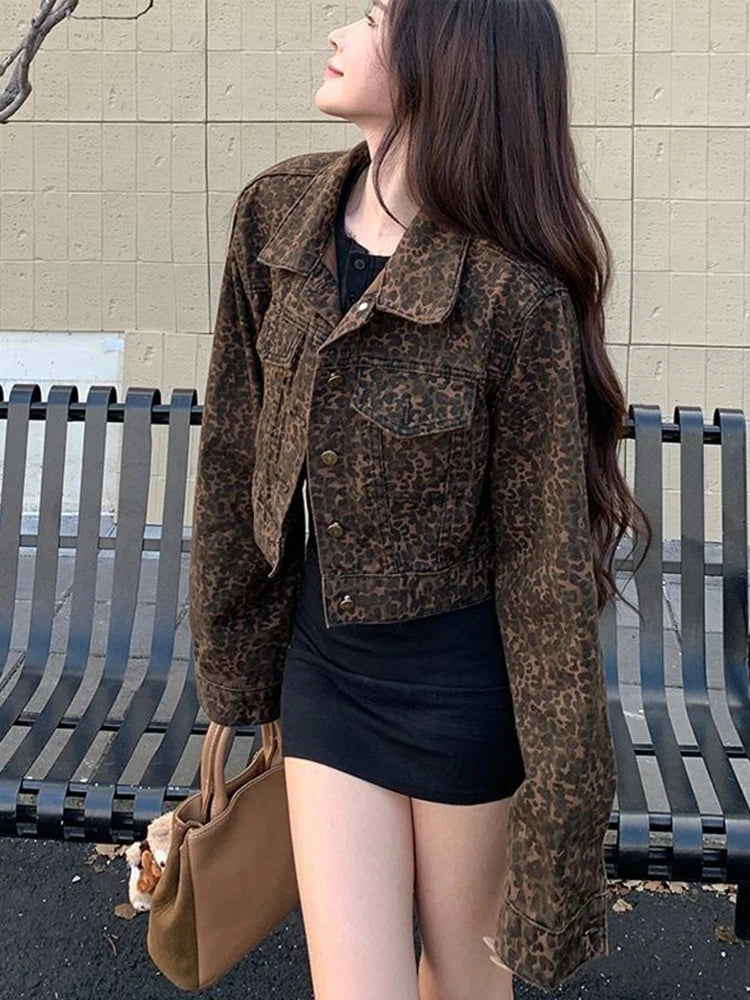 Hnewly Y2K Cropped Leopard Denim Jacket Women Vintage Streetwear Long Sleeve Slim Short Coat American Harajuku Female Hip Hop Tops