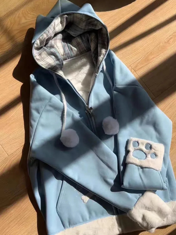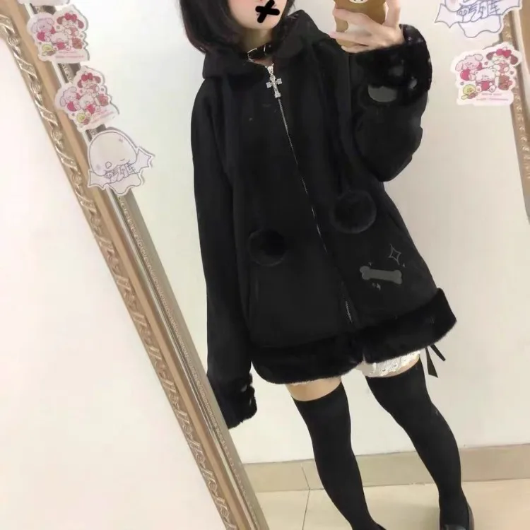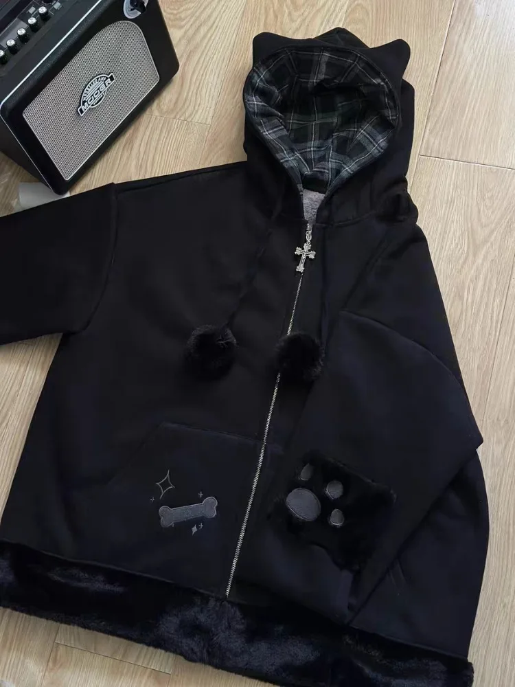 Hnewly Y2k Fashion Black Cat Plaid Patchwork Jackets Autumn New Thicked Warm Tops Mujer Y2k Loose Long Sleeve Zipper Tops Mujer