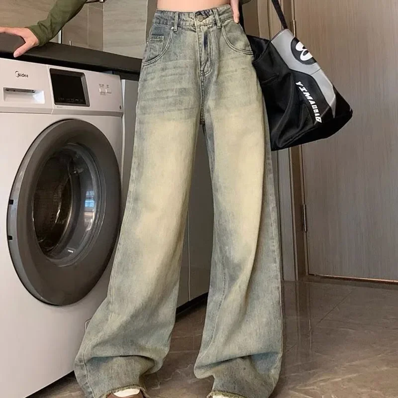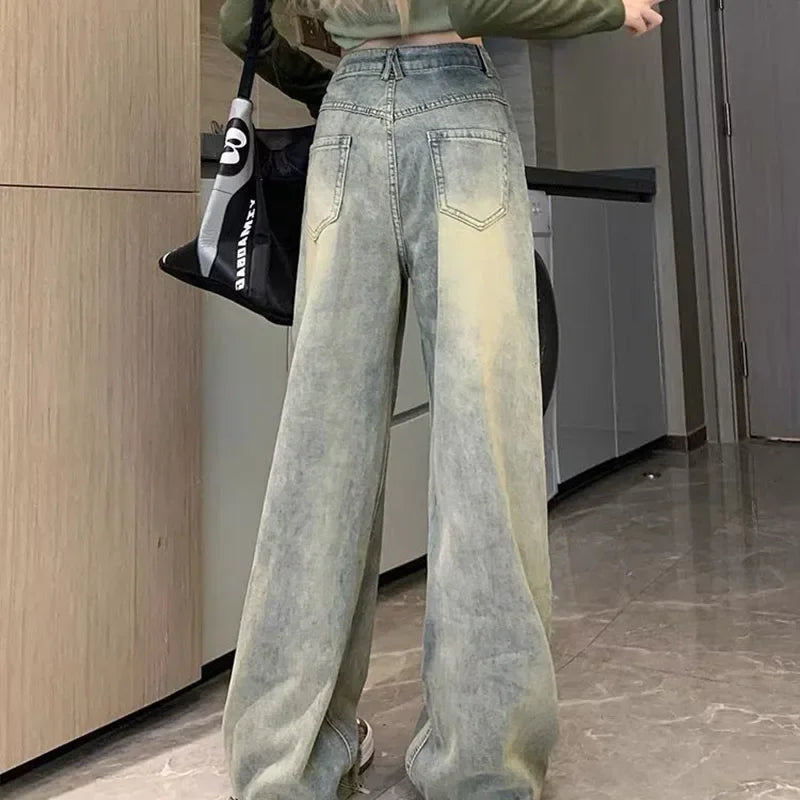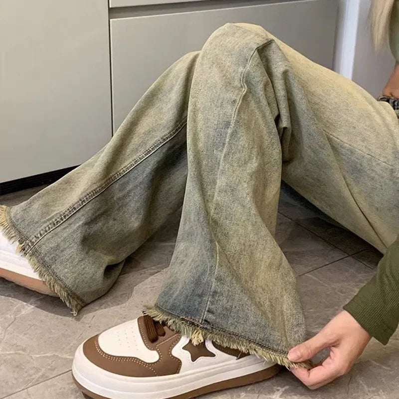 Hnewly Y2K Rough Selvedge Wide Leg Jeans Women Korean High Waisted Baggy Denim Pants Woman Streetwear Vintage Jean Trousers