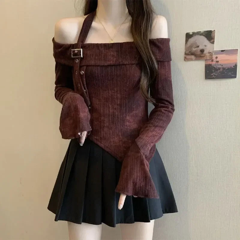 Hnewly Y2K Sexy Slash Neck T Shirt for Women Korean Elegant Off Shoulder Irregular Female Tops Fashion Tie Dye Long Sleeve Pullovers