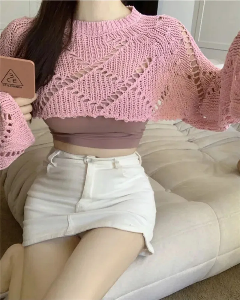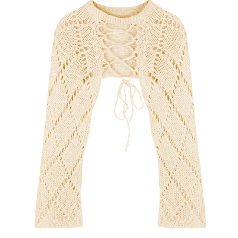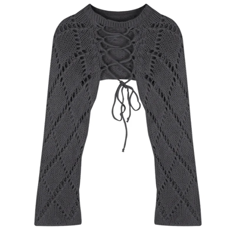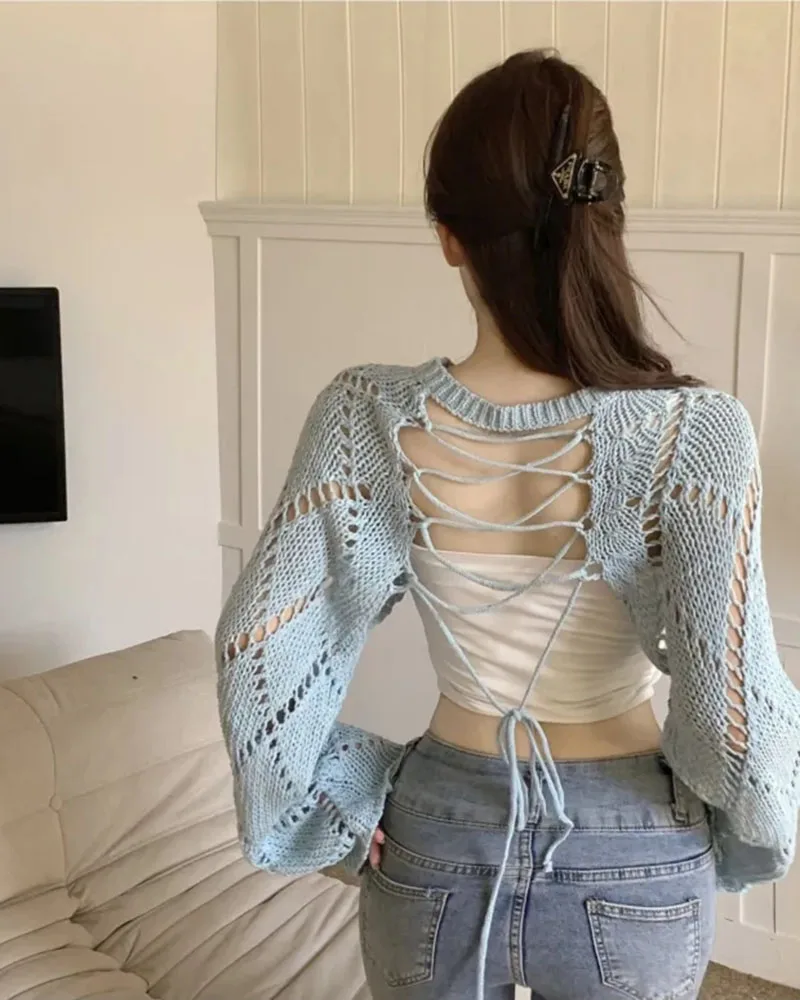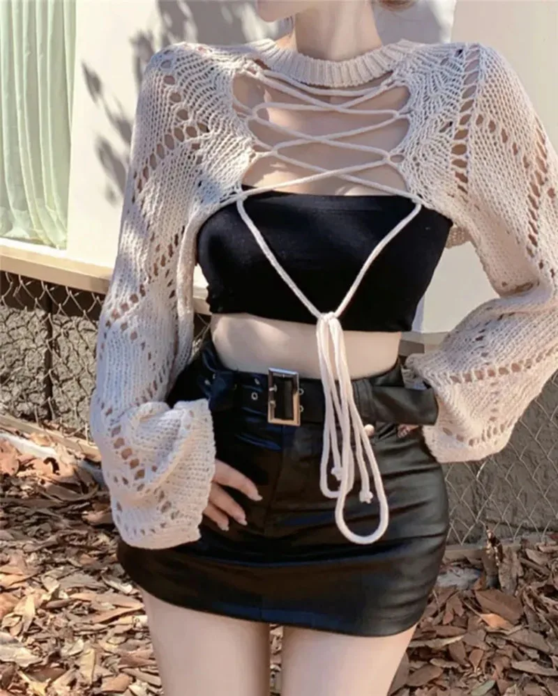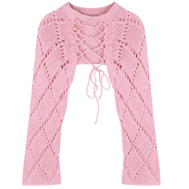 Hnewly Y2K Two-Sided Knitted Tops Women Hollow Long Sleeve Sweet Lace-Up Sweater Harajuku Casual Backless Solid Lady Blouse
