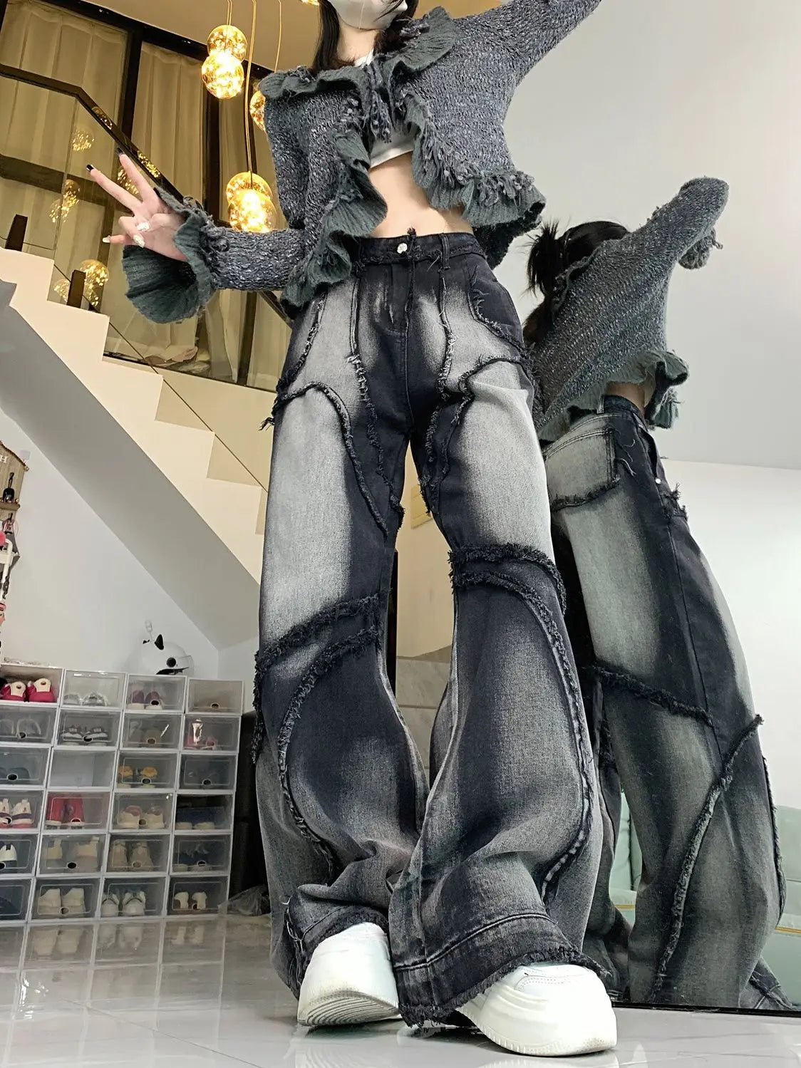 Hnewly Y2k Vintage Jeans Women Wide Leg Pants High Waist Hip-hop Streetwear Black Trouser Retro Baggy Denim Pants Aesthetics