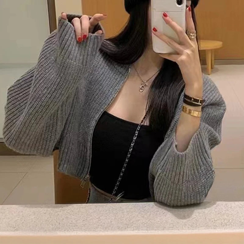 Hnewly Zip Up Knit Sweater Cardigan Women Long Sleeve Boxy Fit Zipper Front Crop Sweater Jacket Teen-girl Fall Winter Acubi Y2k Outfit