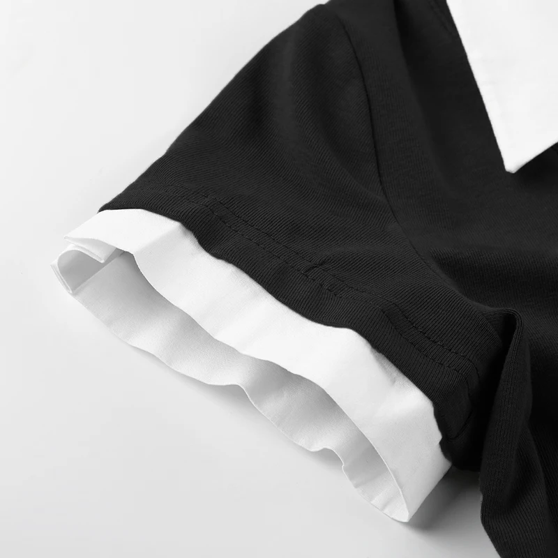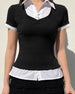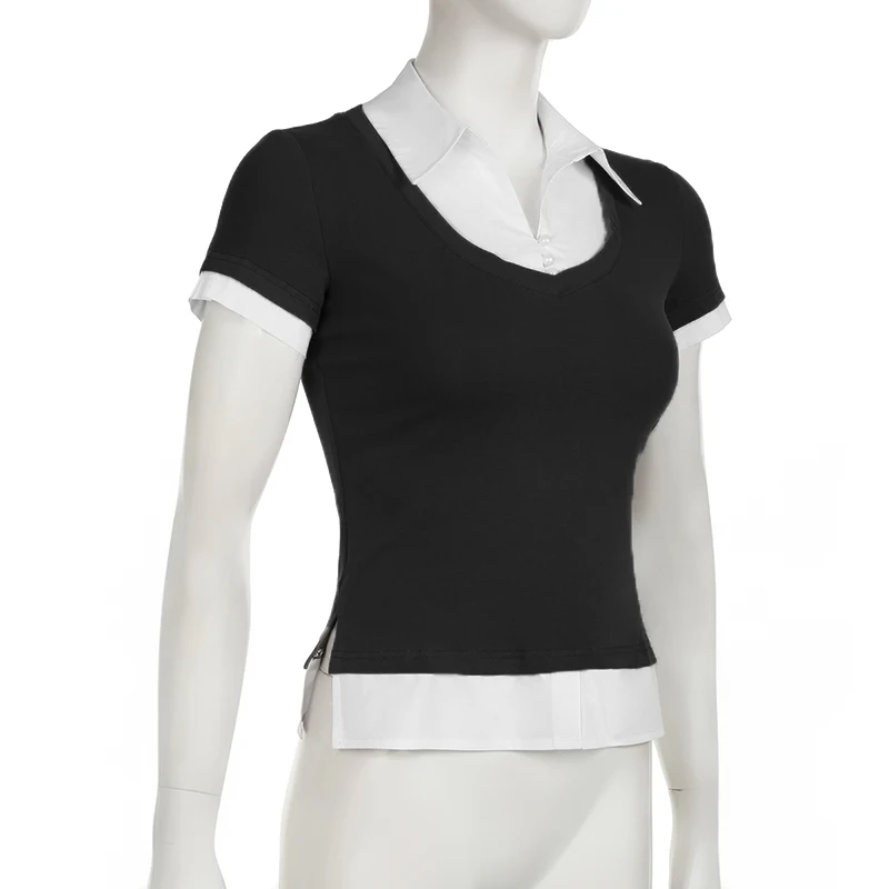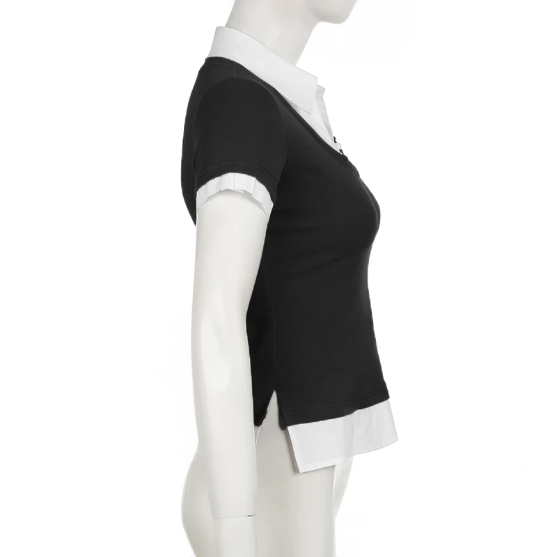 Casual Slim Patchwork T Shirt Fake 2 Piece Basic Turn-Down Collor Short Sleeve Tees Women 2024 Summer Fashion Streetwear