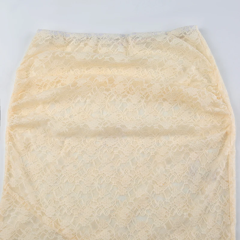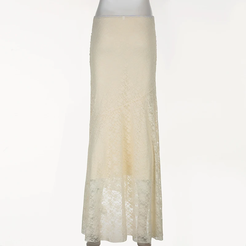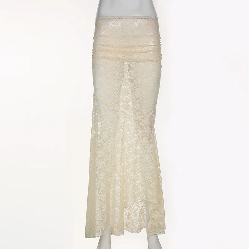 Elegant Fashion Slim Lace Trumpet Skirt Holiday See Through Sexy Mid-Waisted Maxi Skirts Women Autumn Spring Ladies