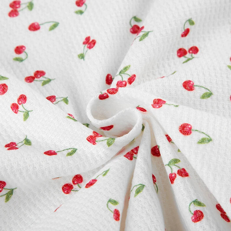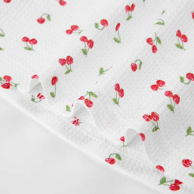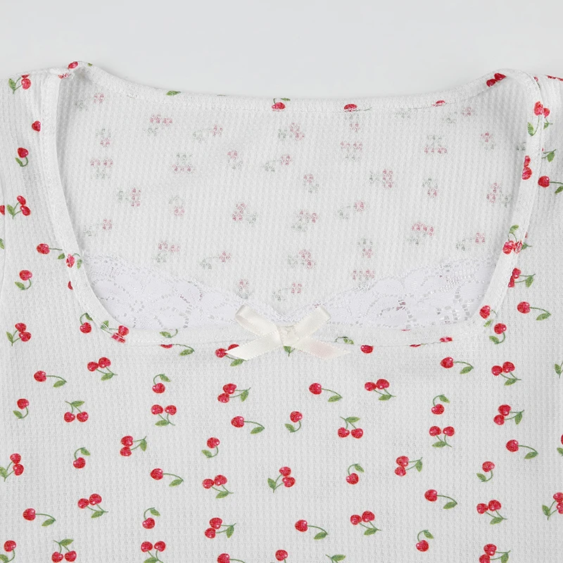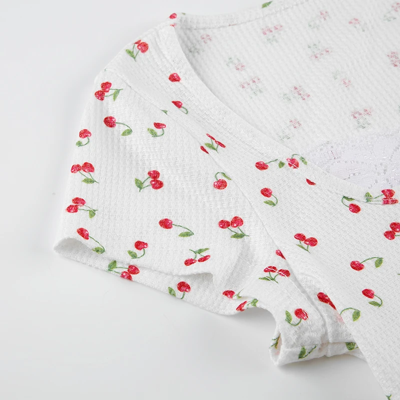 Sweet Cherries Printed Lace Trim T Shirt Sexy Slim Square Collar Short Sleeve Tees Women 2024 Summer Fashion Streetwear