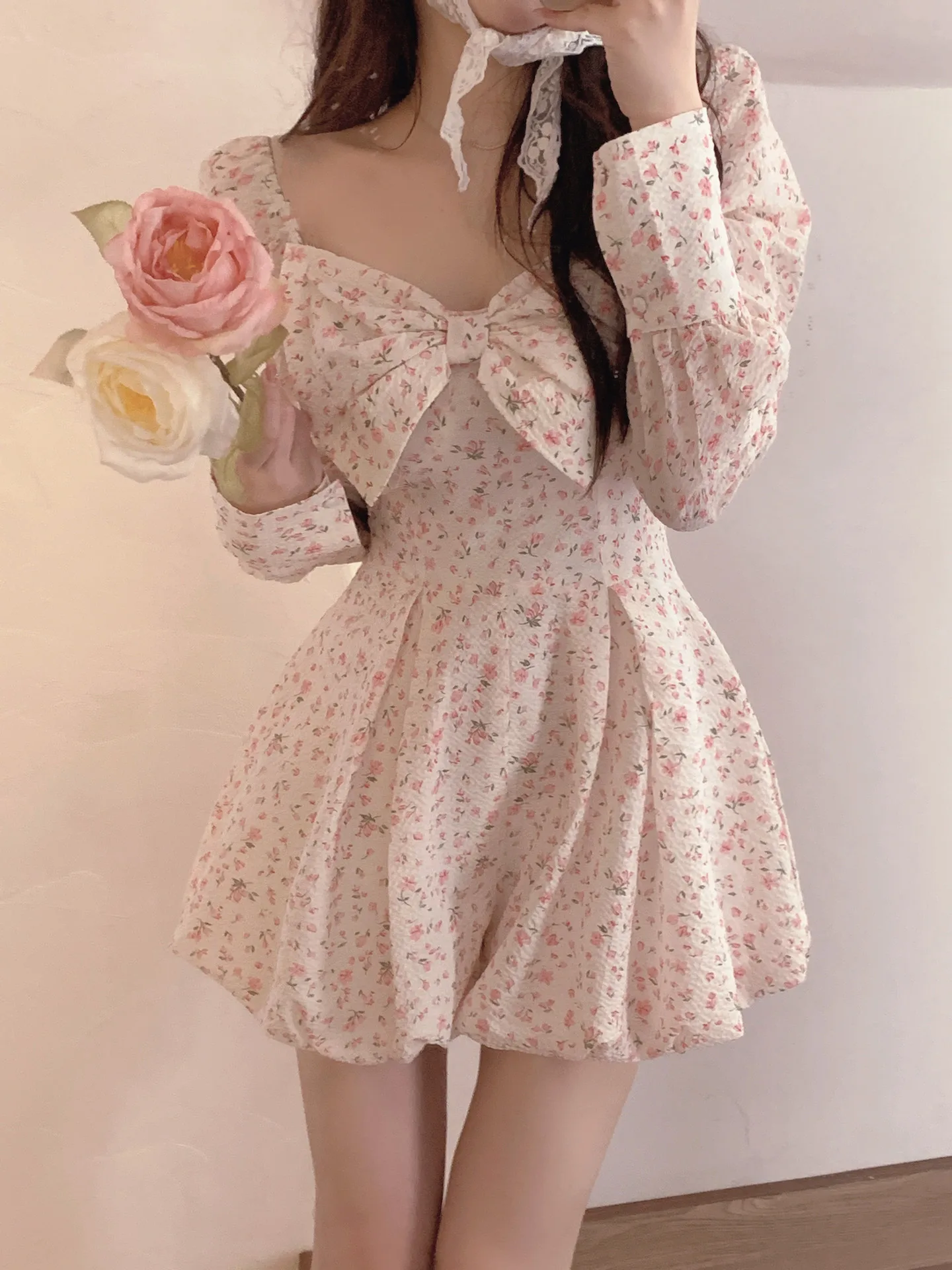 Japanese Sweet Floral Lolita Dress Women Bow Chic Elegant Beach Party Dresses Ladies Y2k Pink Kawaii Summer One-piece Dress
