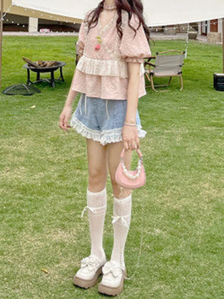 Japanese Sweet Lace-up Denim Shorts Women Summer Lace Ruched Elegant Jeans Female Korean Fashion Bow Hight Waist Shorts New