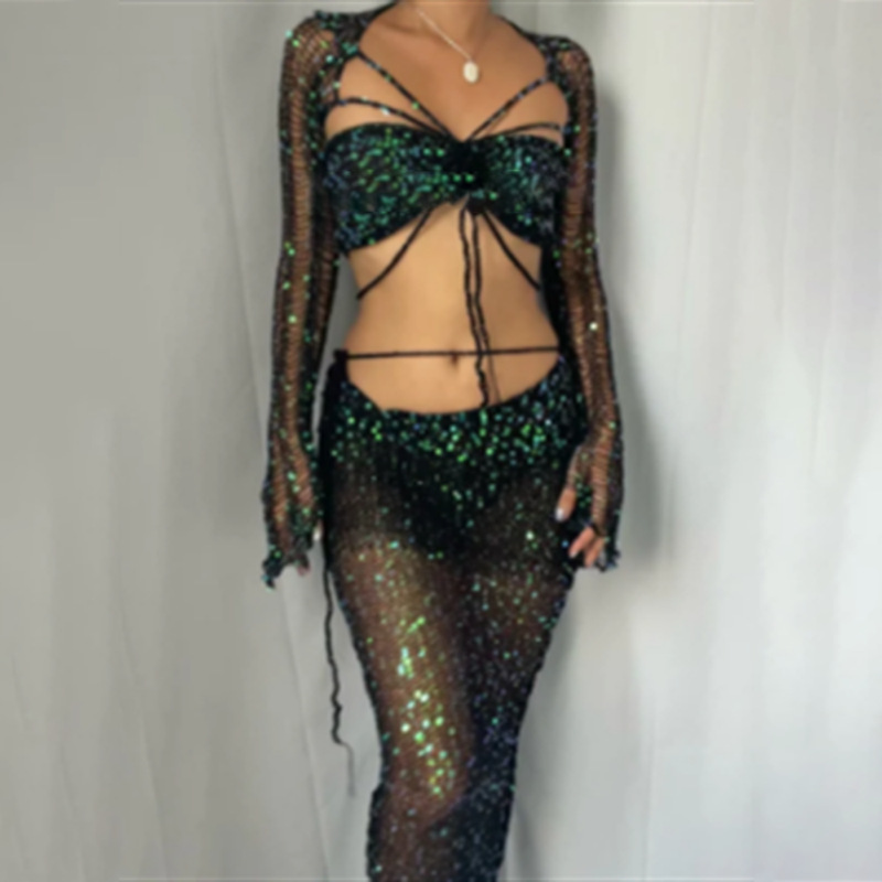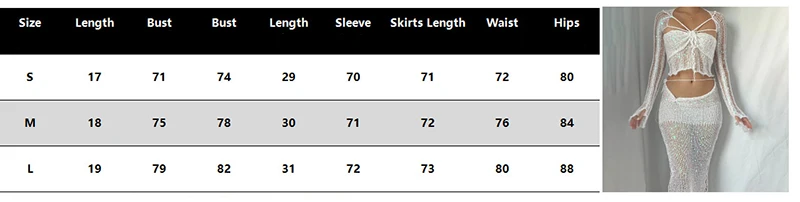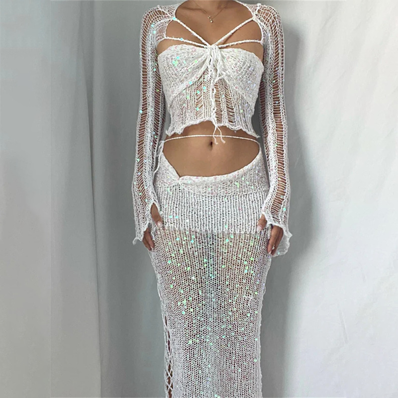 Knitted Skirt Sets Sequins Two Pieces Set Long Sleeve Crop Top and Skirt Suit Glitter Sets Sexy Crochet Matching Sets for Women