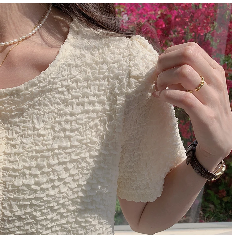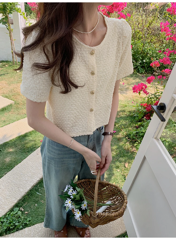 Korean Chic O-neck Short Sleeve Shirt Women Fashion Buttons Slim Short Tops Female Blouse Ladies Elegant Summer Blouses