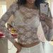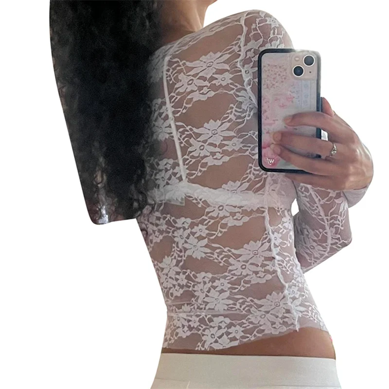 Lace Coquette Top Women Sexy Sheer See Through Floral Round Neck Long Sleeve T Shirt y2k Aesthetic Clothing Streetwear