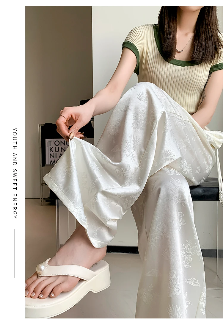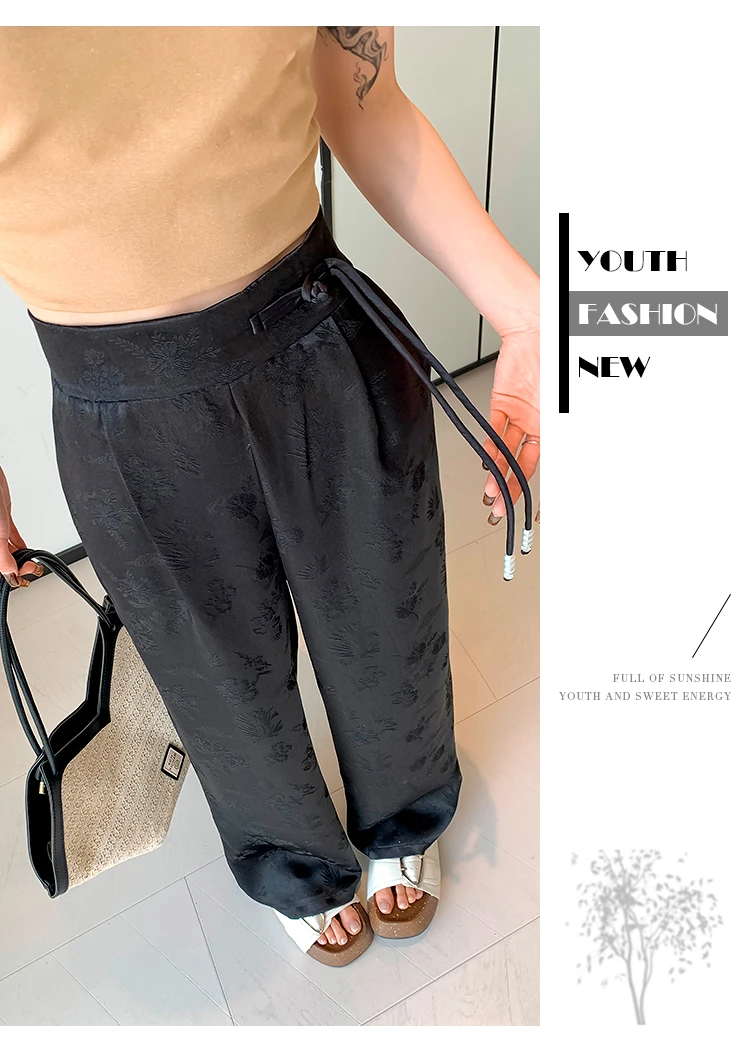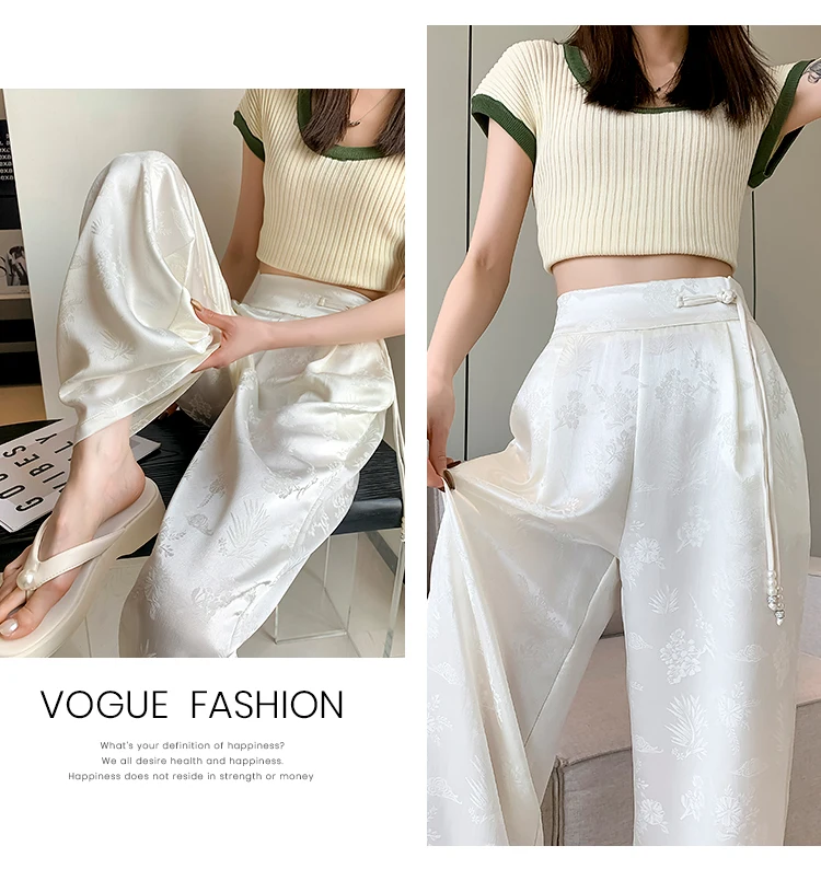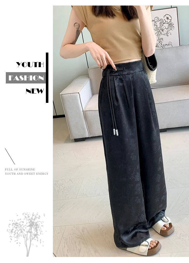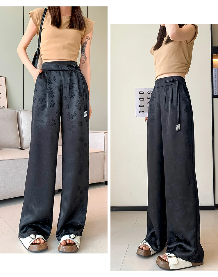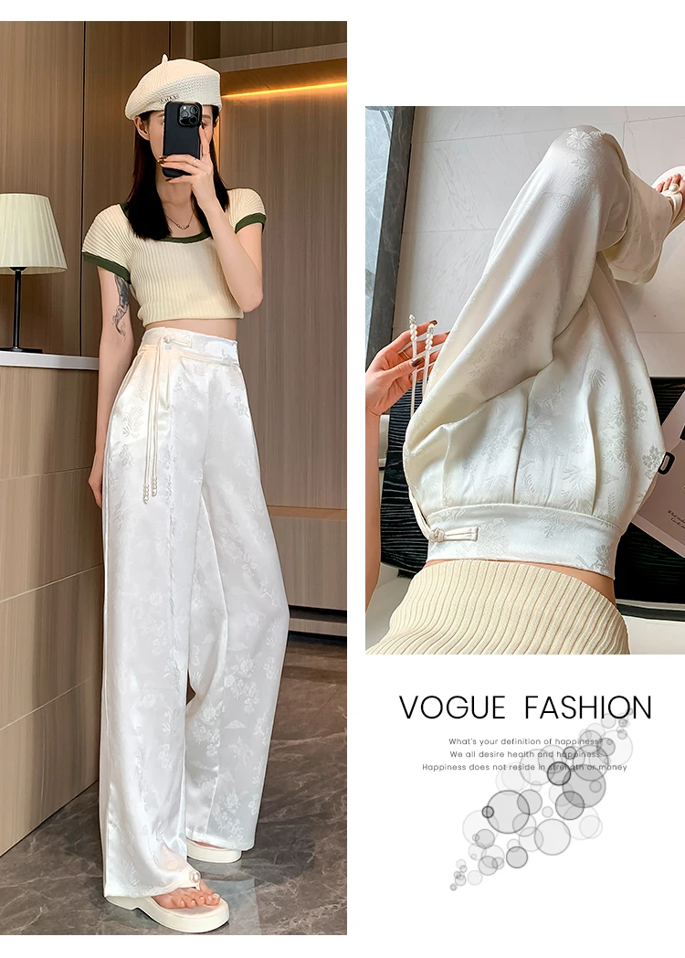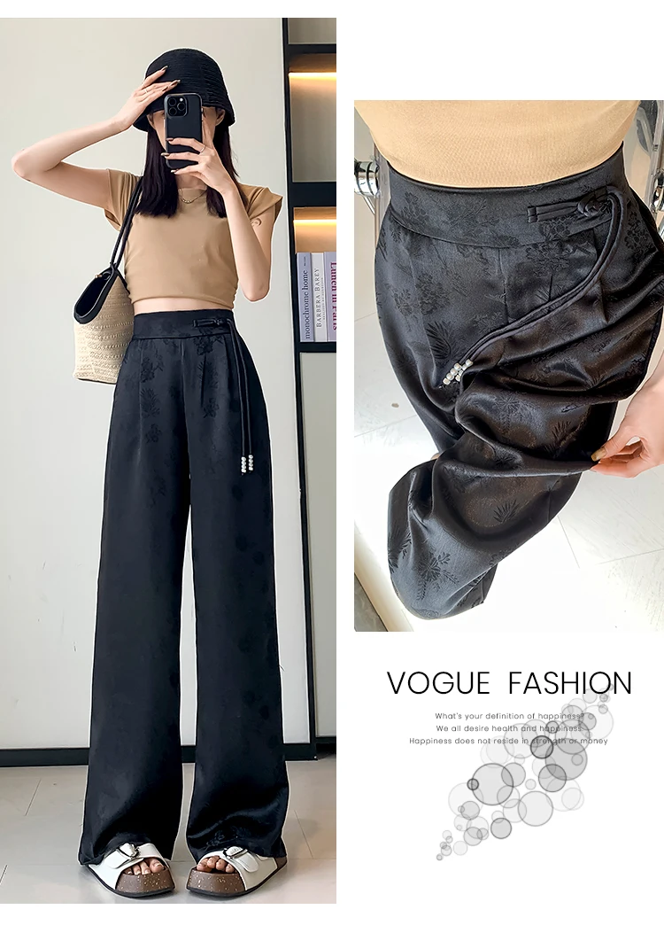 New 2024 Spring Summer Wide Leg Loose Pants For Women Black Or White Color Chinese Style High Waist Jacquard Trousers Women