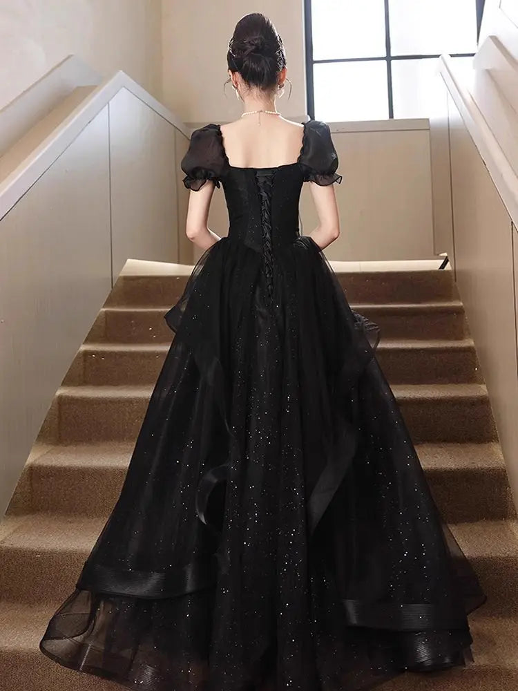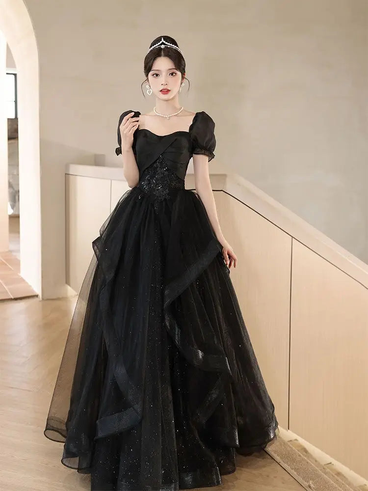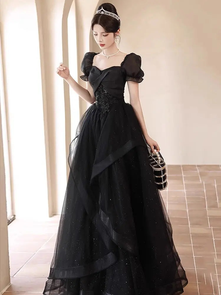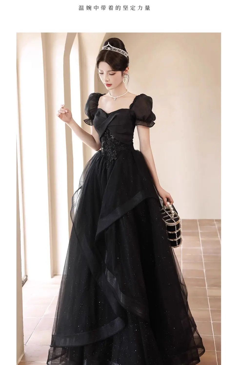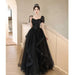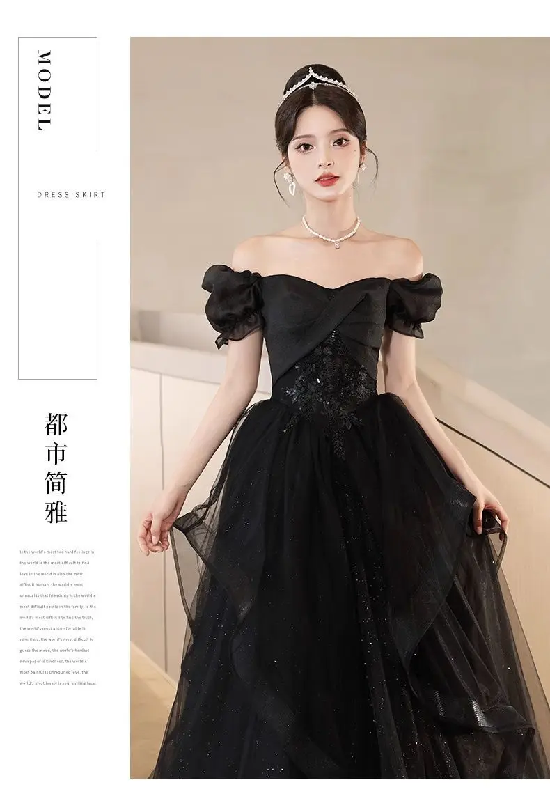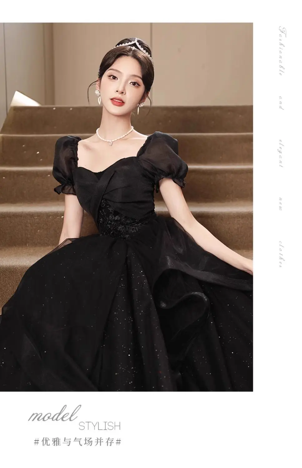 New Graduation High School Dress French High end Black Long Evening Dresses for Women Bubble Sleeve Bridesmaid Wedding Dress
