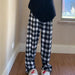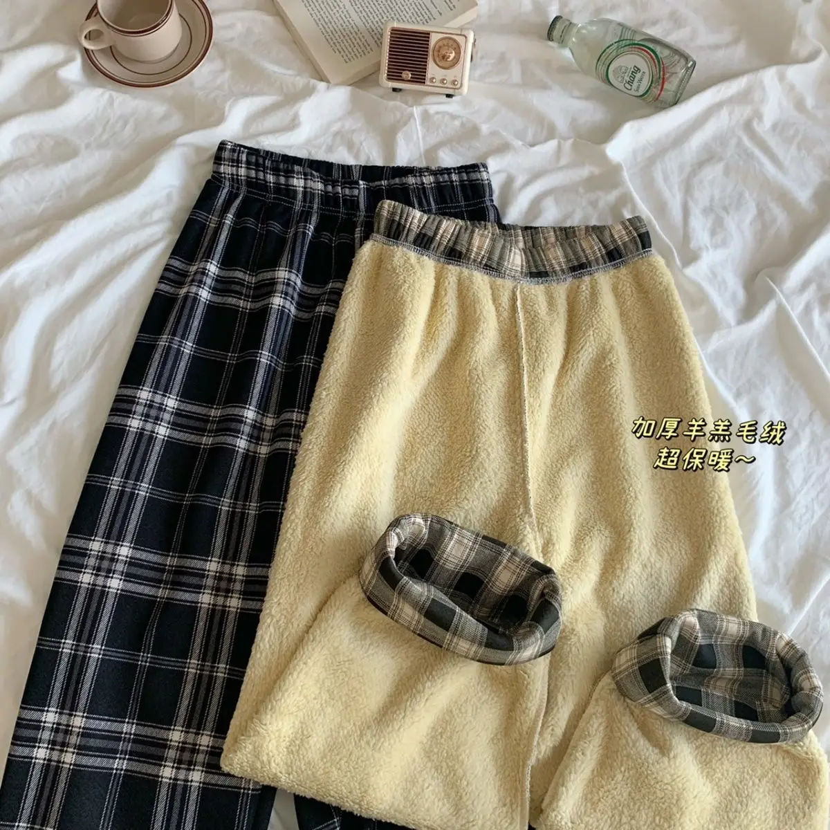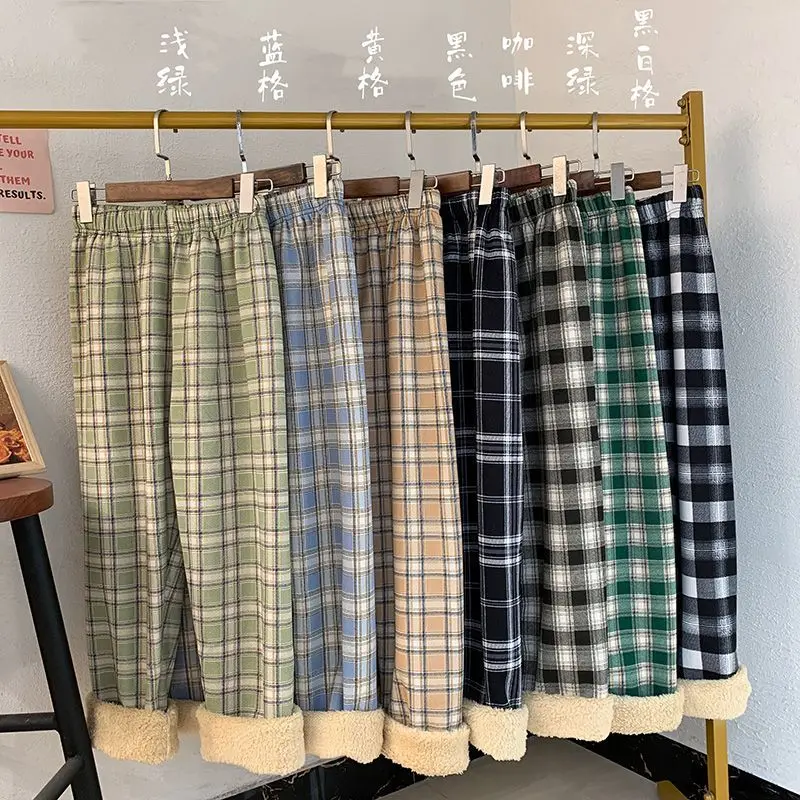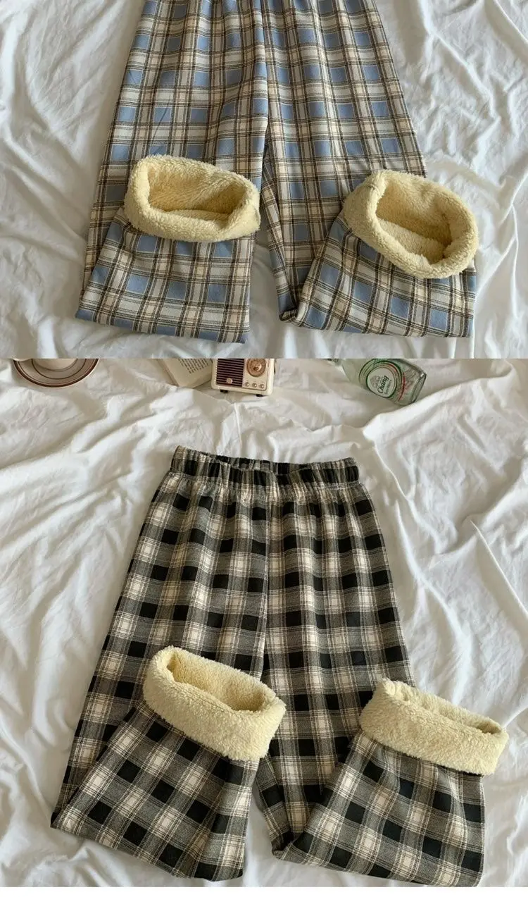 Padded Thickened Wide Leg Pants Winter LambswoolPlaid Pants Female High Waist Casual Straight Pants