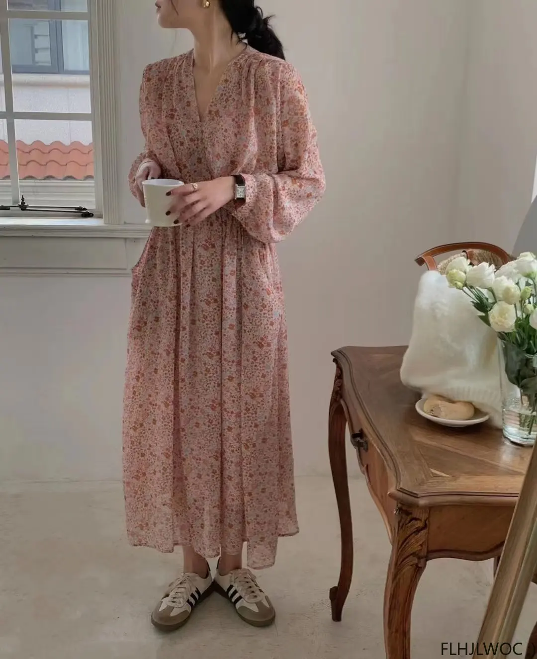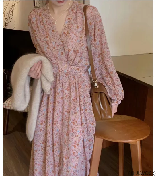 Pink Romantic Long Fairy Dresses 2023 Summer French Design Women Holiday Chiffon Flower Floral Retro Vintage Long Maxi Dress FLHJLWOC