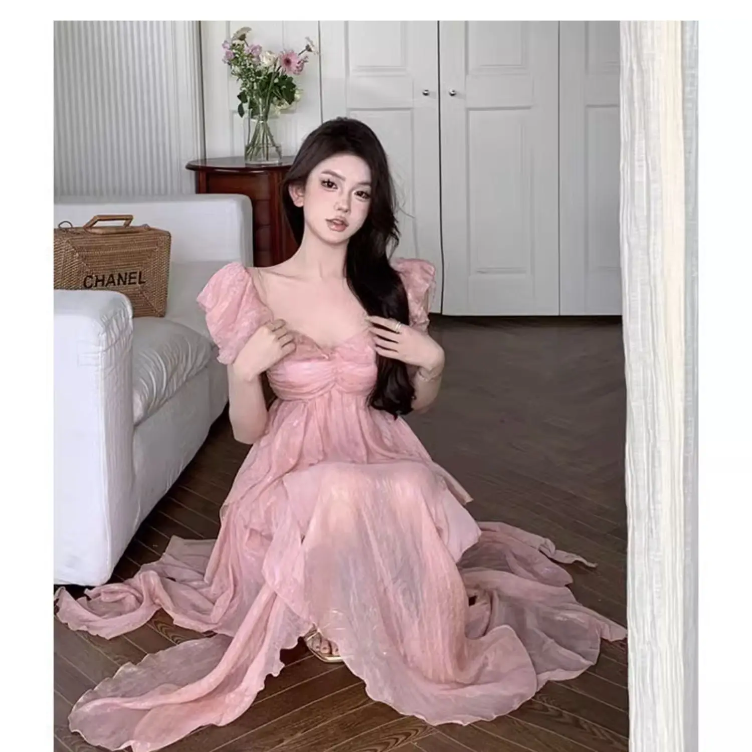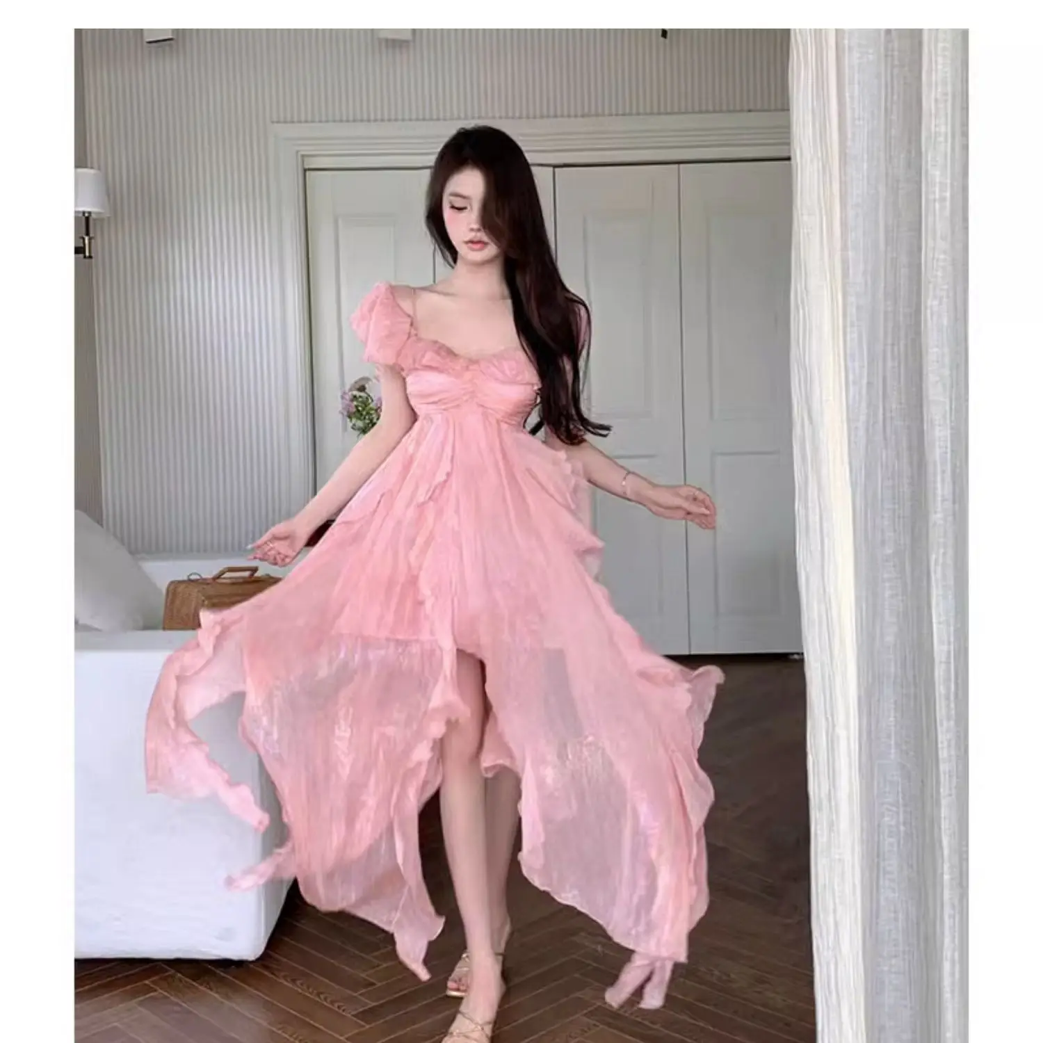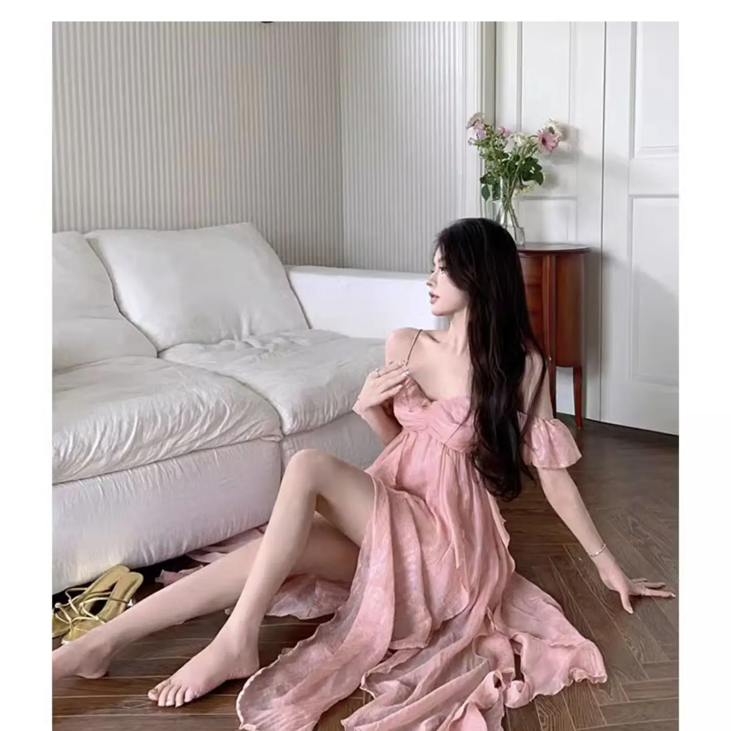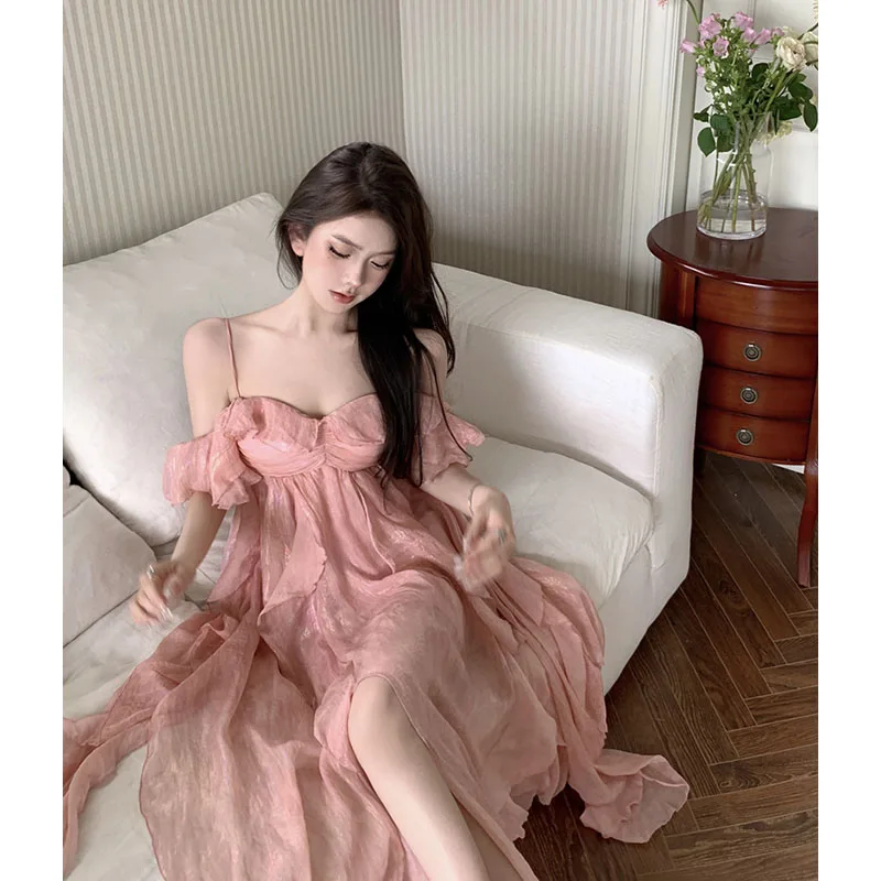 Pink Strap Dress New off-Shoulder Ruffled Skirt for Women