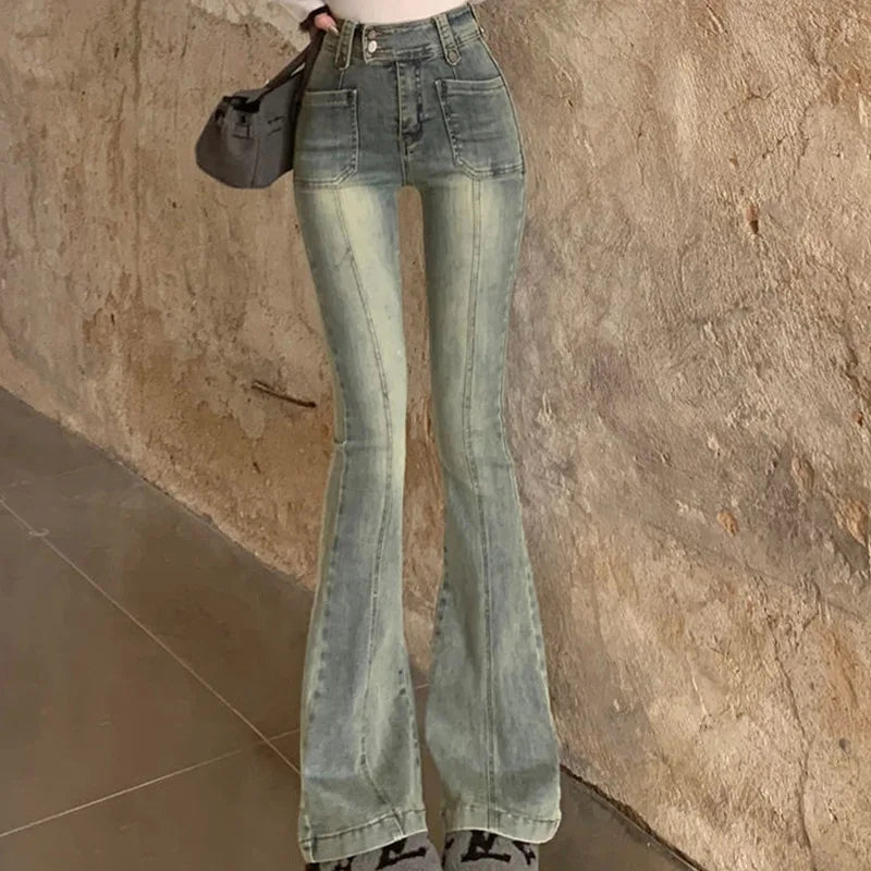 Pockets Vintage High Waist Skinny Jeans Female Hong Kong Style Denim Bell Bottom Pants Spicy Girl Blue Oversized Boot Cut Jeans