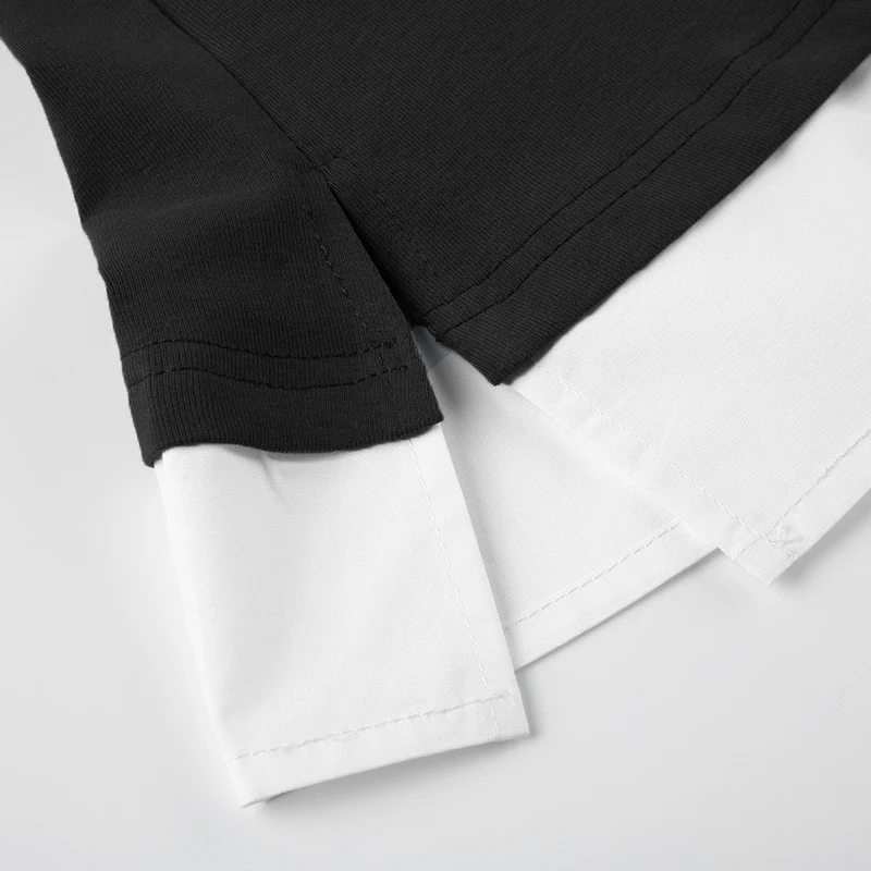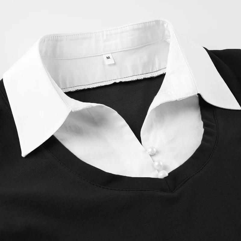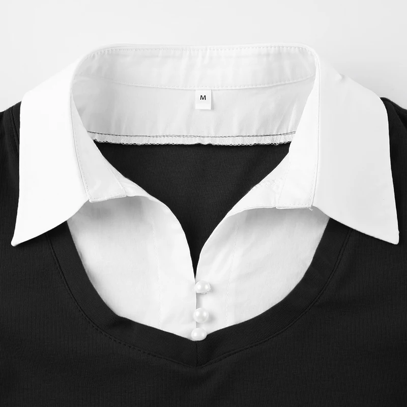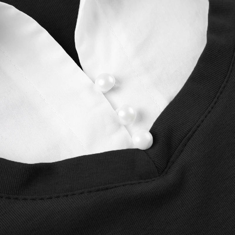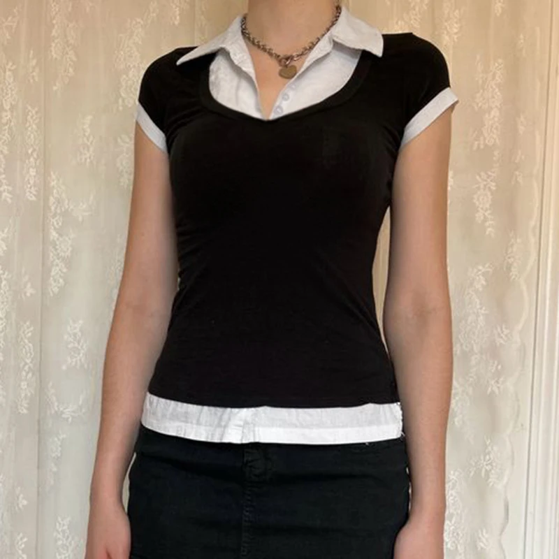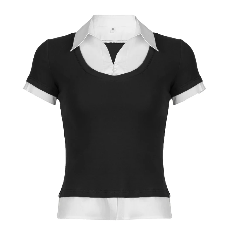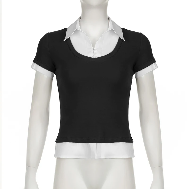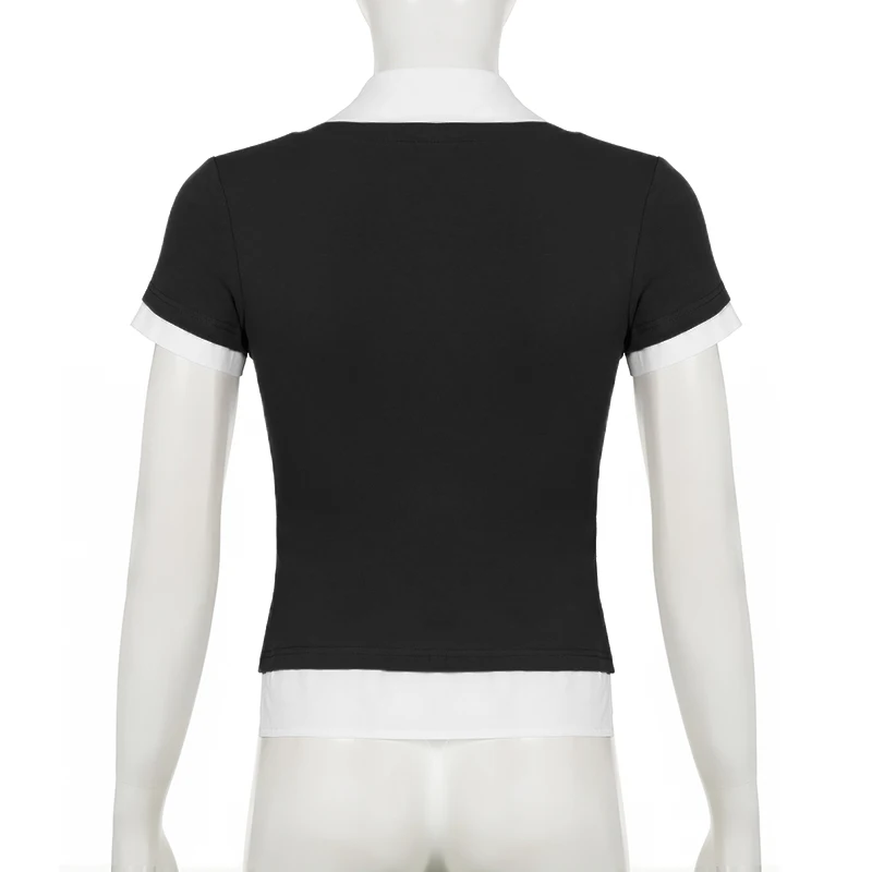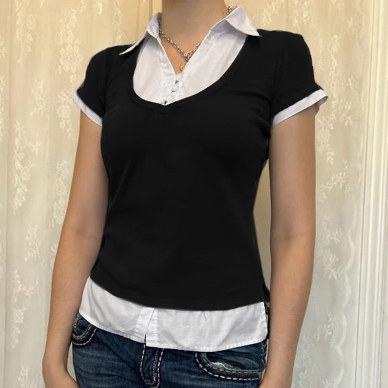 Preppy Style Fake Two-piece Cropped Top Chic Patchwork Turn Down Neck Short Sleeve T-shirt y2k Harajuku Women Black Shirt
