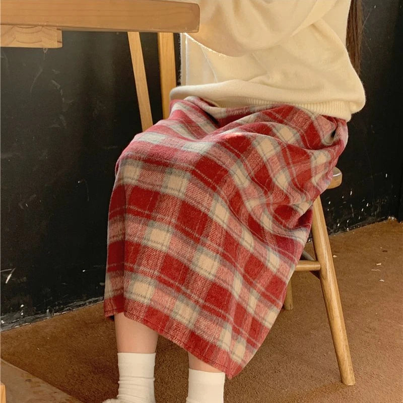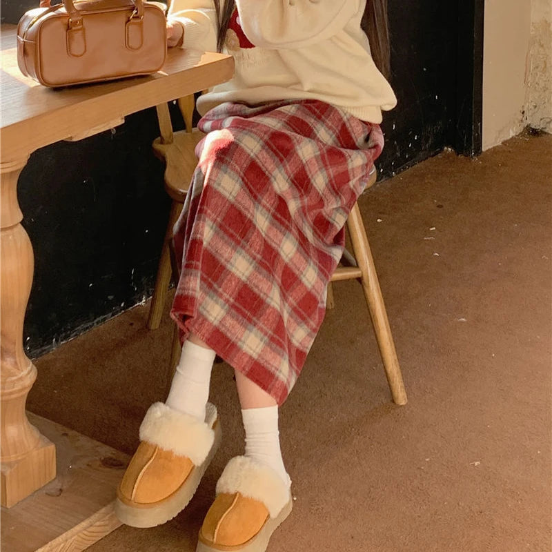 Preppy Style Wool Long Skirt Vintage Kawaii Sweet Korean Fashion Plaid Skirts Cute Autumn Winter Patchwork Midi Skirts