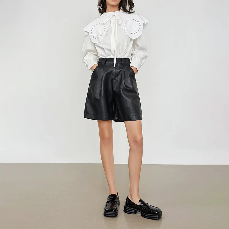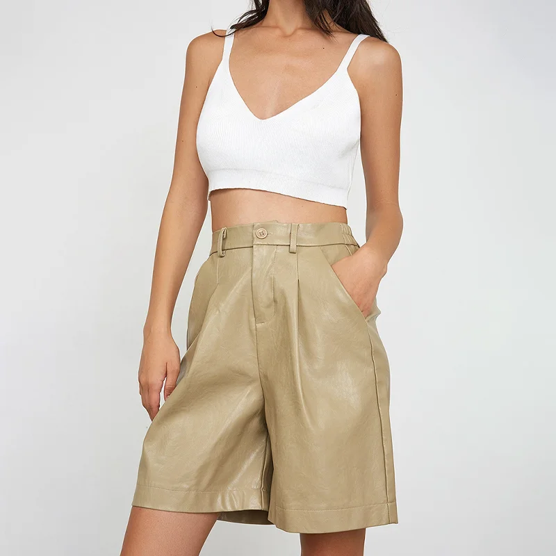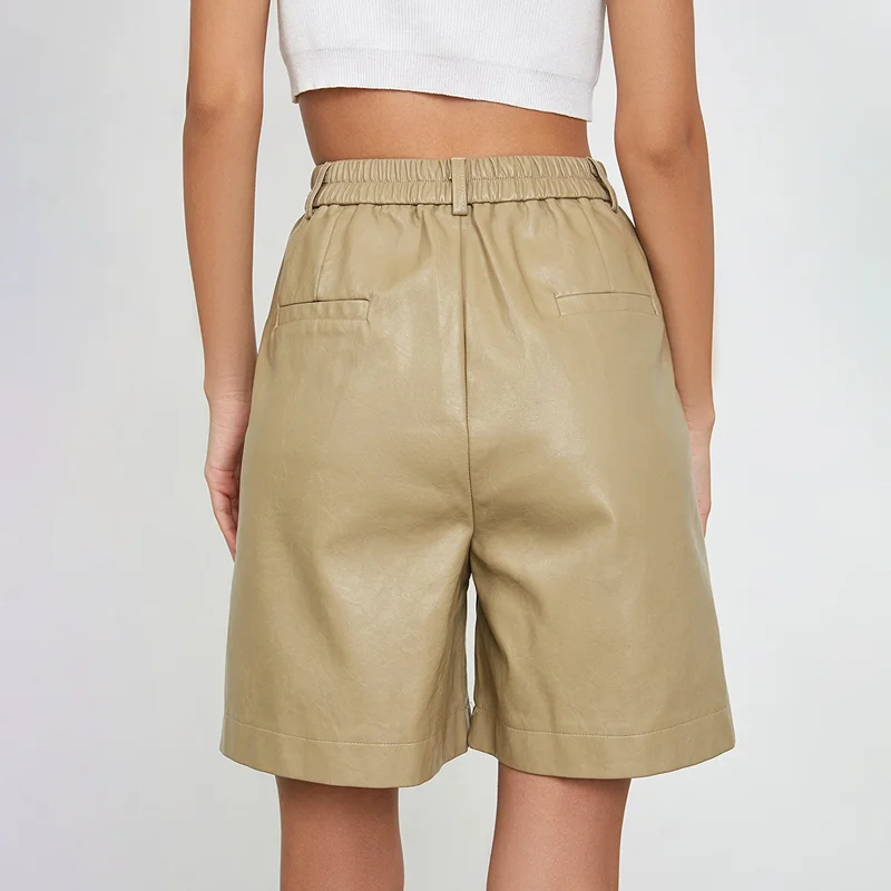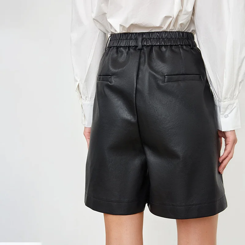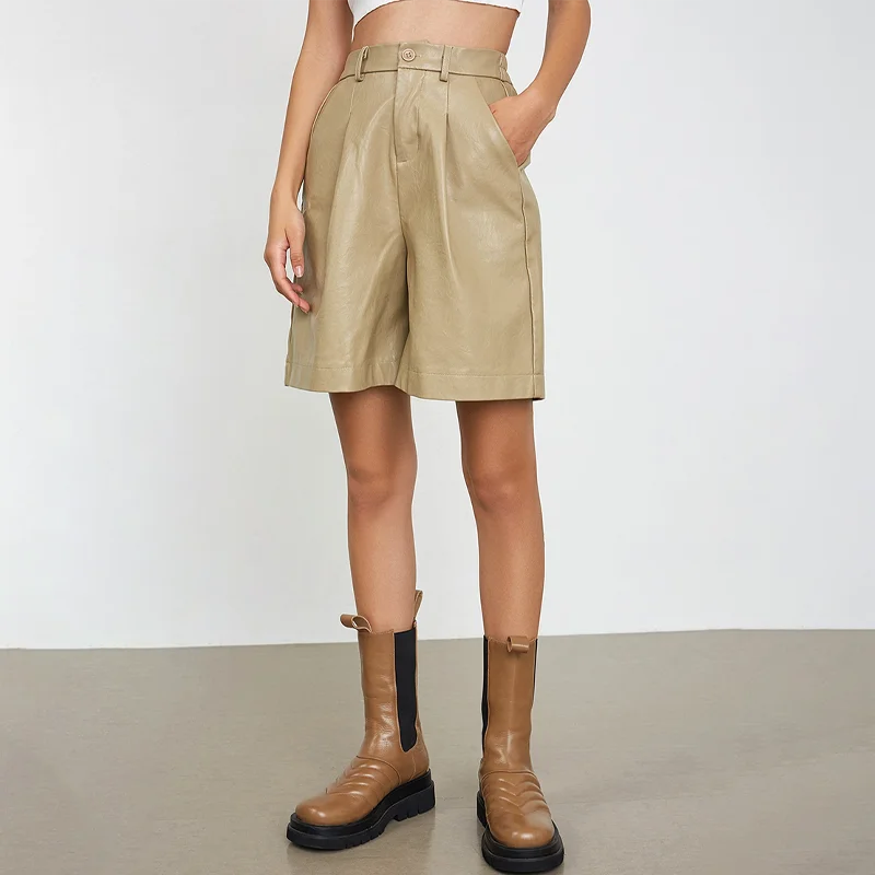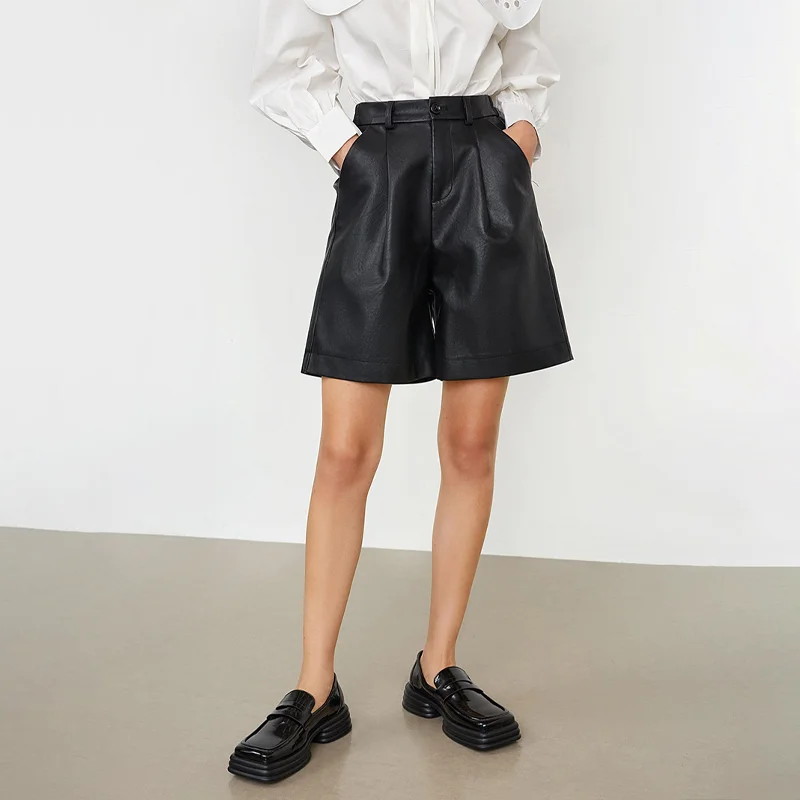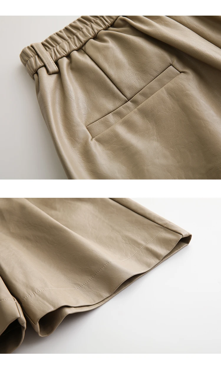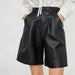 Pu Leather Women Shorts Button Quality Wide Leg Faux Leather Shorts England Style High Waist Loose Shorts Femme Womens Clothing