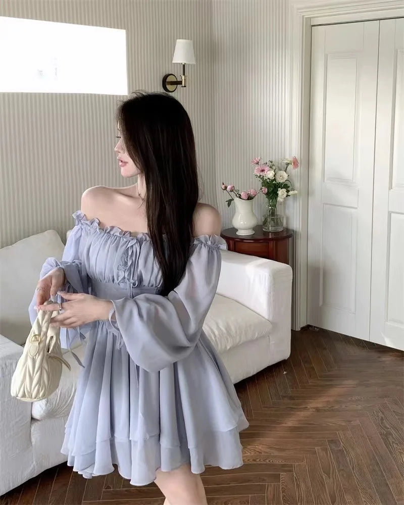 Dresses Women Solid Retro Long Sleeve Slash Neck Autumn Gentle Korean Style Streetwear All-match Lovely Comfortable Stylish Chic