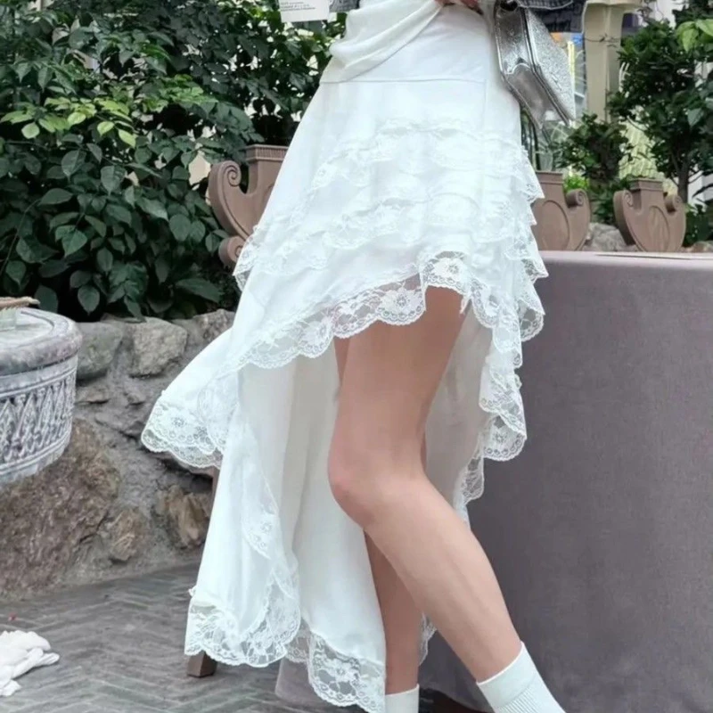 Ruffle Lace Irregular Skirt Women Elegant Boho White A-line Skirts Aesthetics Patchwork Korean Style Vintage Y2K Skirt