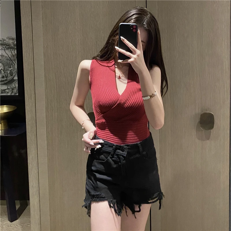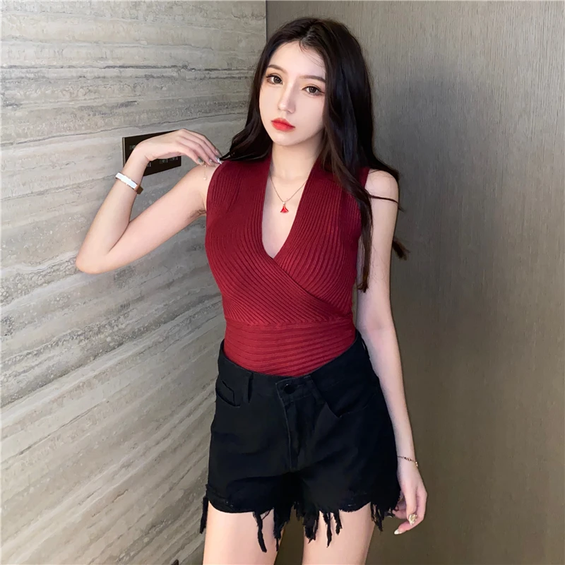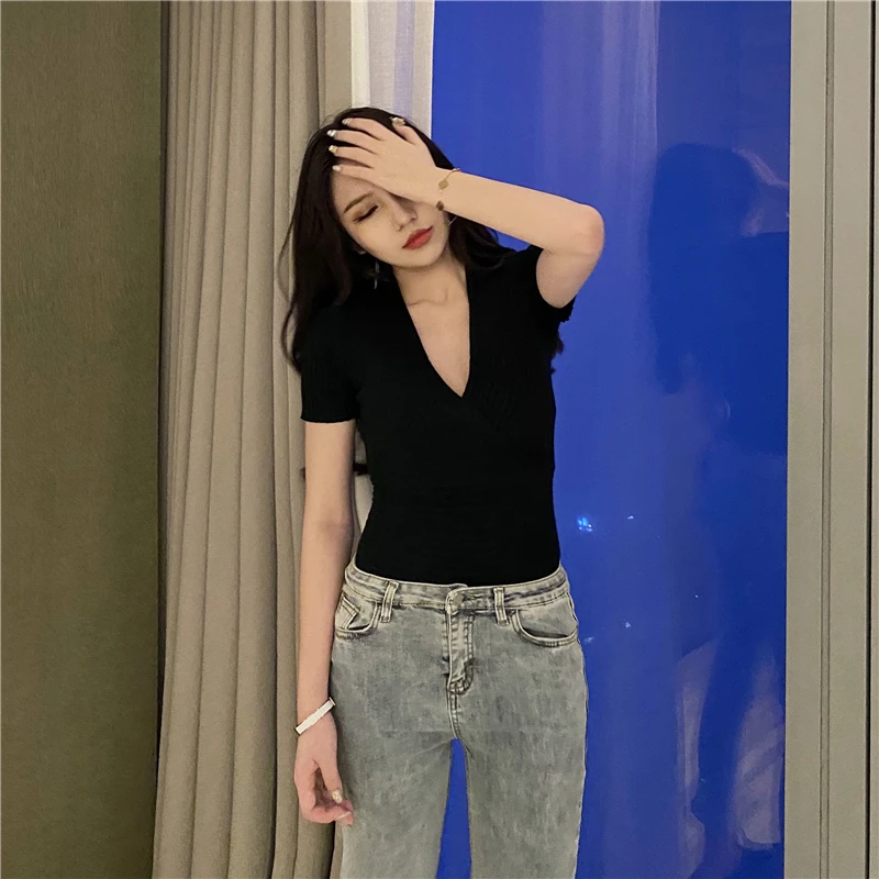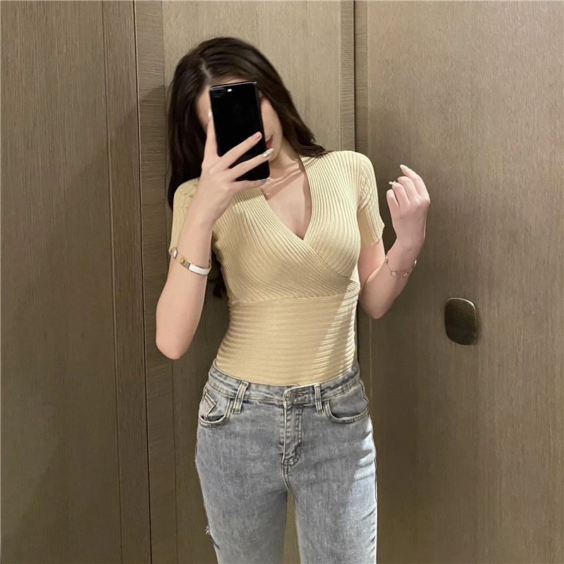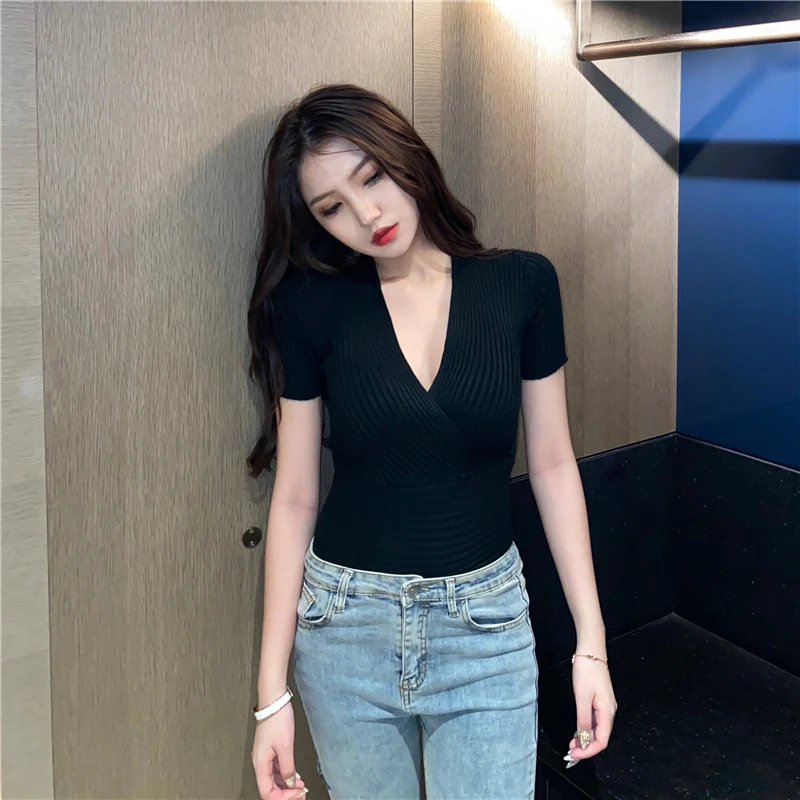 Sexy Knitted T-shirts Women's Tight Low Cut Short Sleeve Sexy Deep V-neck Cropped Top 2024 Summer Stretch Sweaters Woman T Shirt