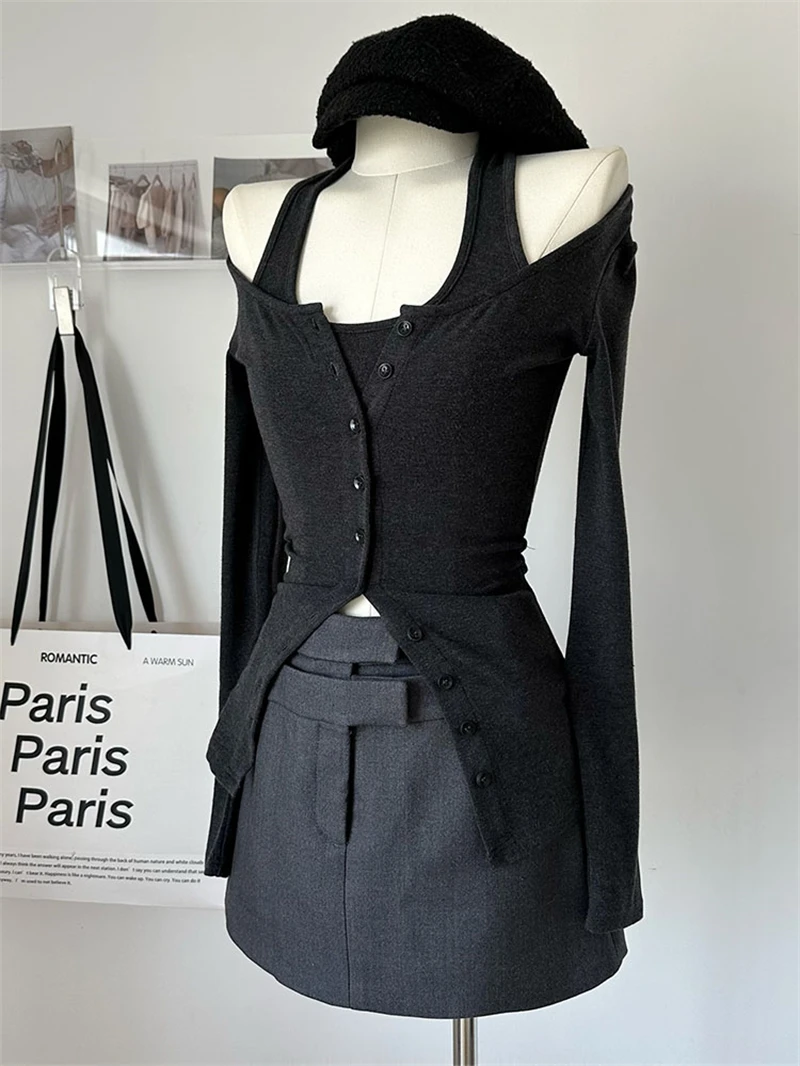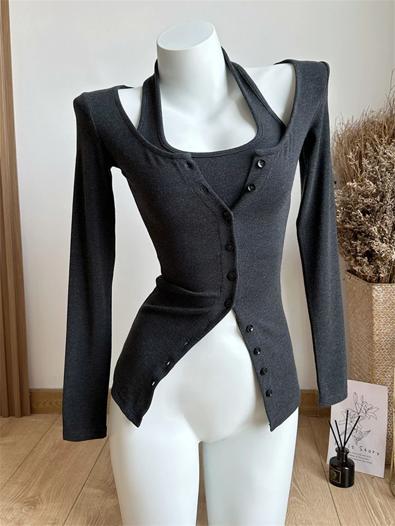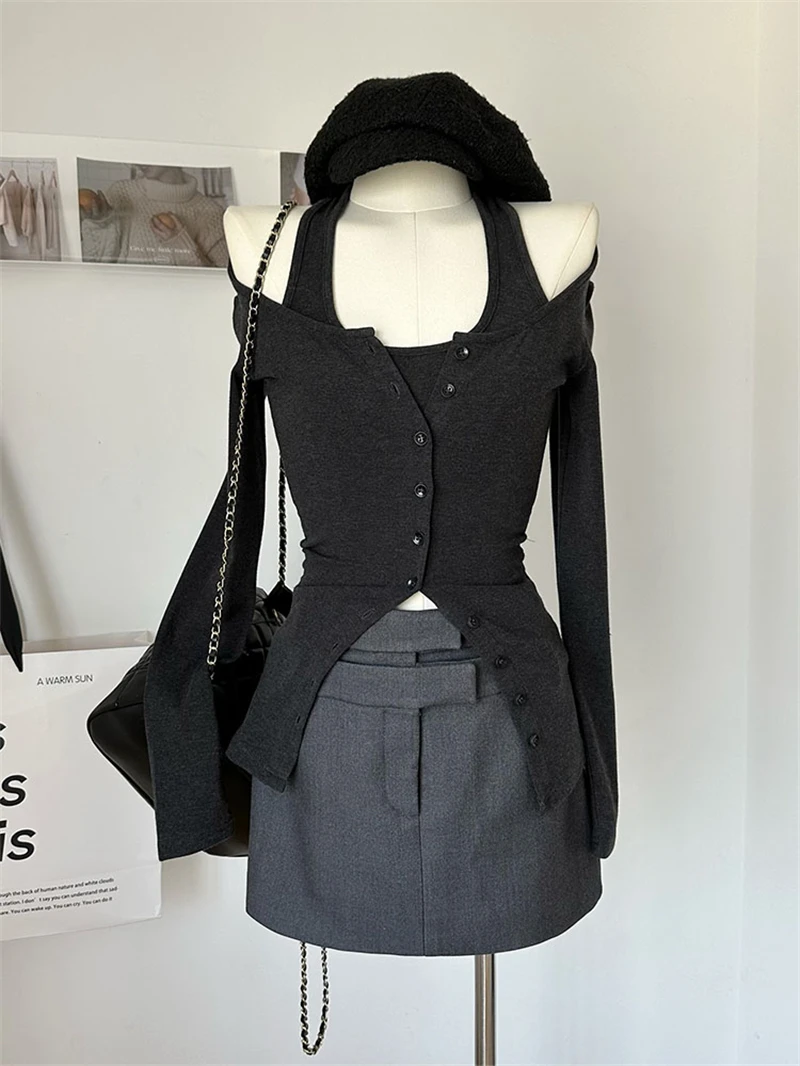 Sexy Retro Streetwear Crop Top Coquette Gothic Chic Gyaru Black Halter T-Shirt Fake Two Pieces Off Shoulder Tees Clubwear Kpop