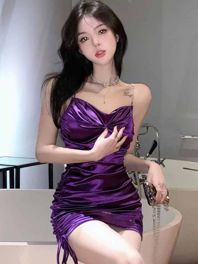 Shirring Dresses Women Slim Purple Korean Style Sexy Mini Summer High Waist V-neck Spaghetti Strap Ladies Fashion Elegant Chic