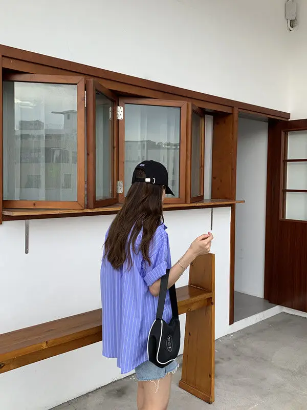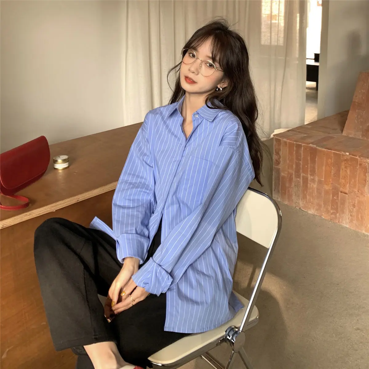 Shirts Women Blue Striped Loose Harajuku Long Sleeve Casual Spring Tops Students All-match Fashion Simple Korean Ulzzang Chic