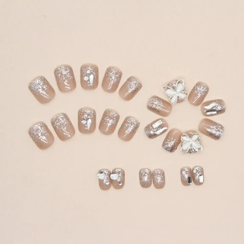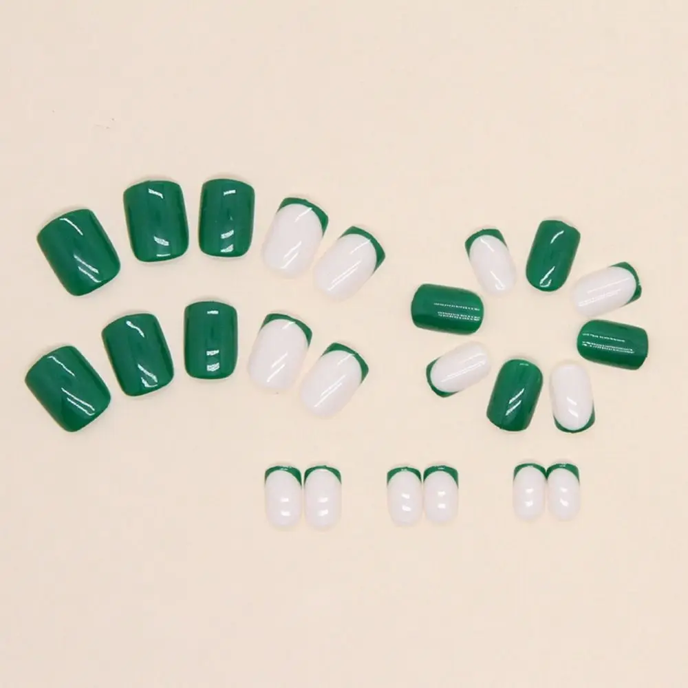 Short Round False Nails Detachable French Pink Butterfly Nail Tips Full Cover Green Edge Fake Nails for DIY