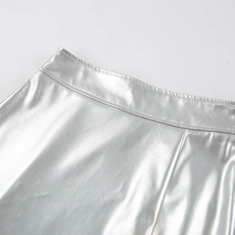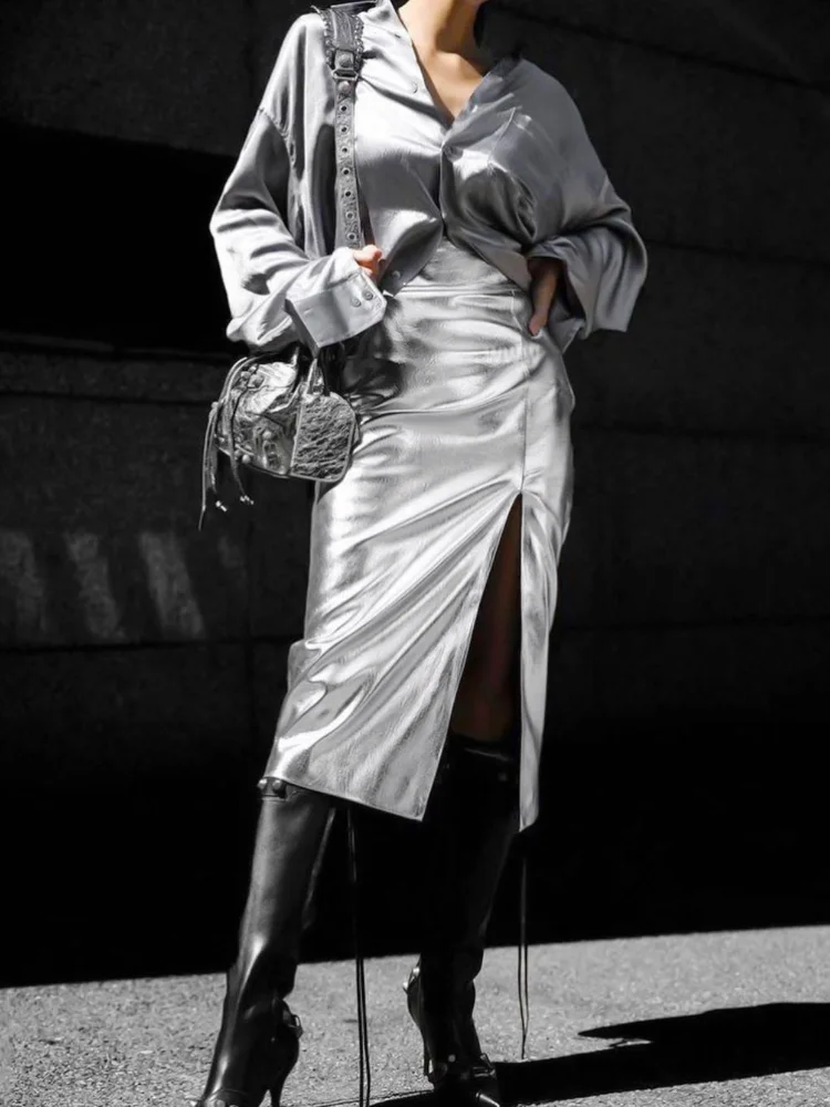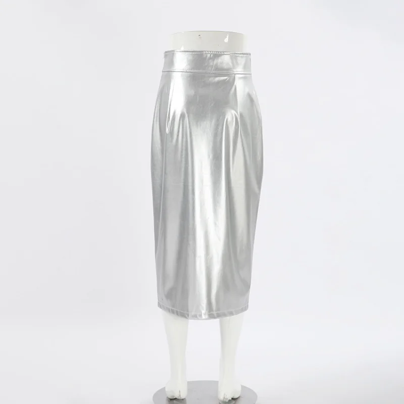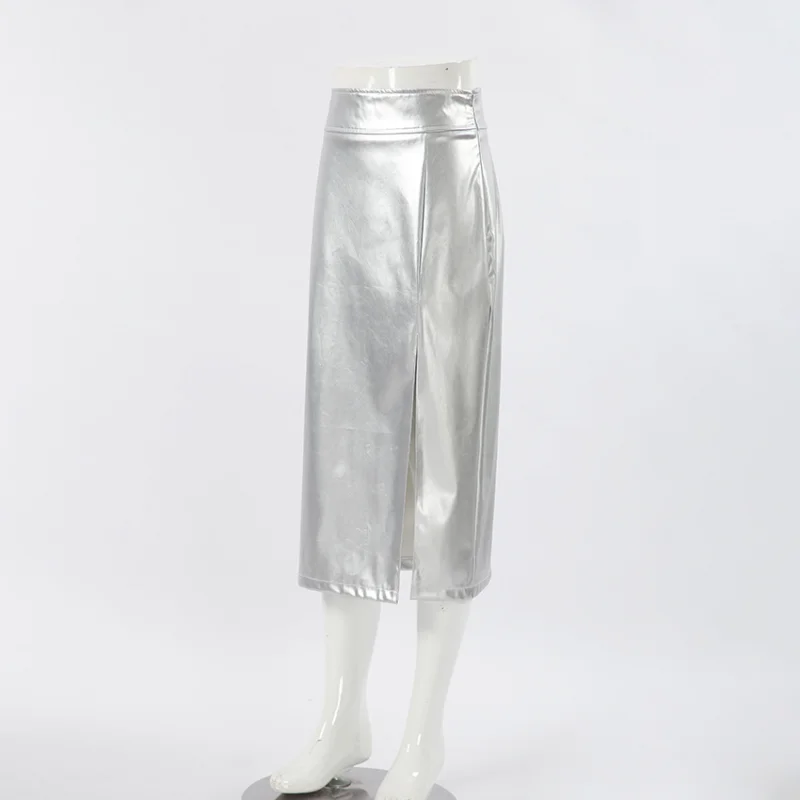 Slit Silver Skirts Women Elegant High Waist Leather Pu Long Skirts Autumn Slim Party Sexy Straight Skirts Female Vintage Y2k