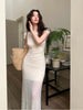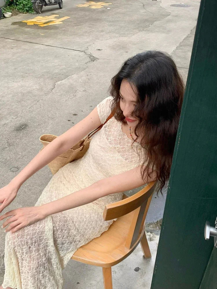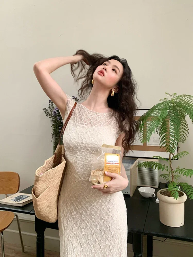 Summer 2000s Vintage Y2k Bodycon Dresses Korean Beige 2 Piece Dress Sets Frence Retro Elegant Original Design Lace Flowers Dress