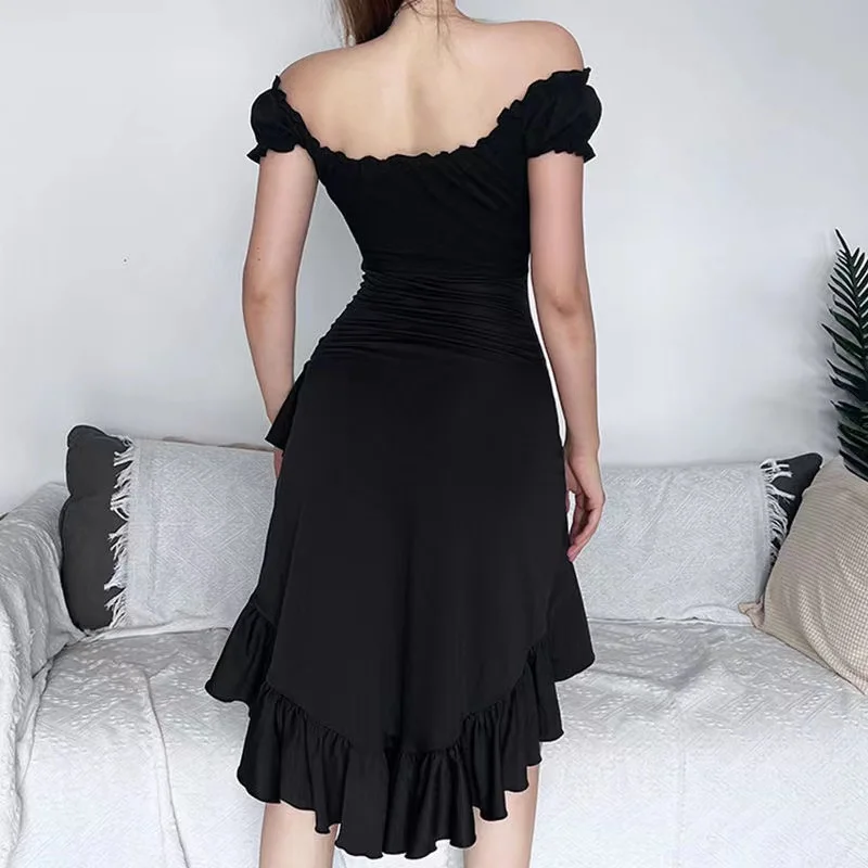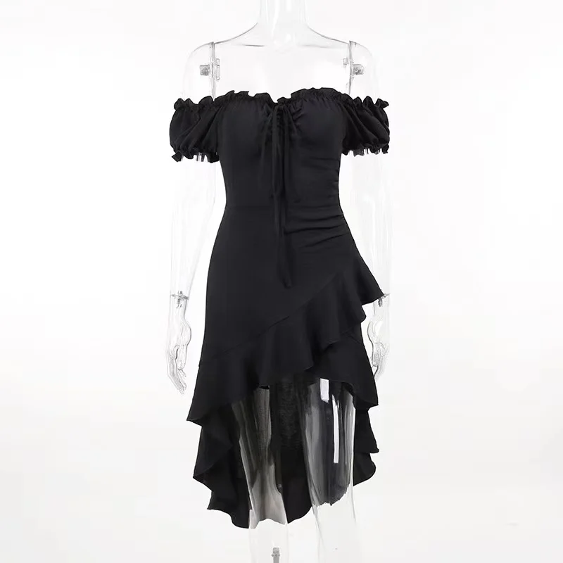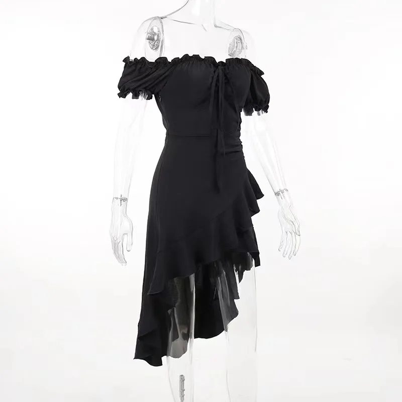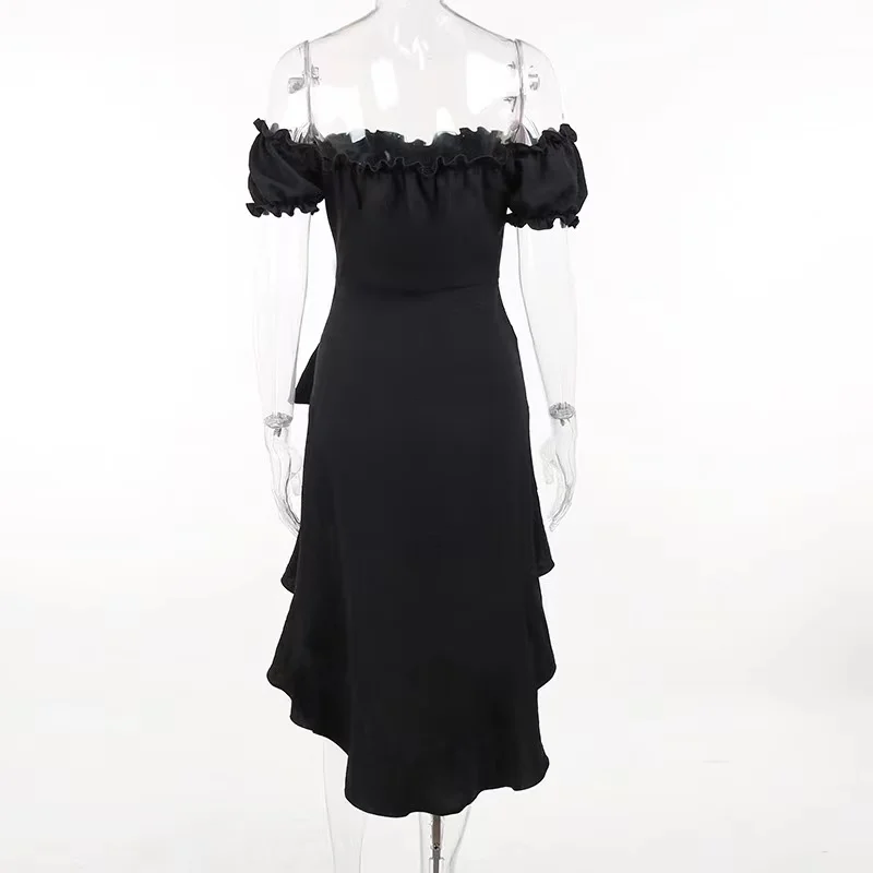 Summer Black A-LINE Dress Women Streetwear Sexy Off Shoulder Short Sleeves Ruffled Mid Length Dresses Club Elegant Partywear