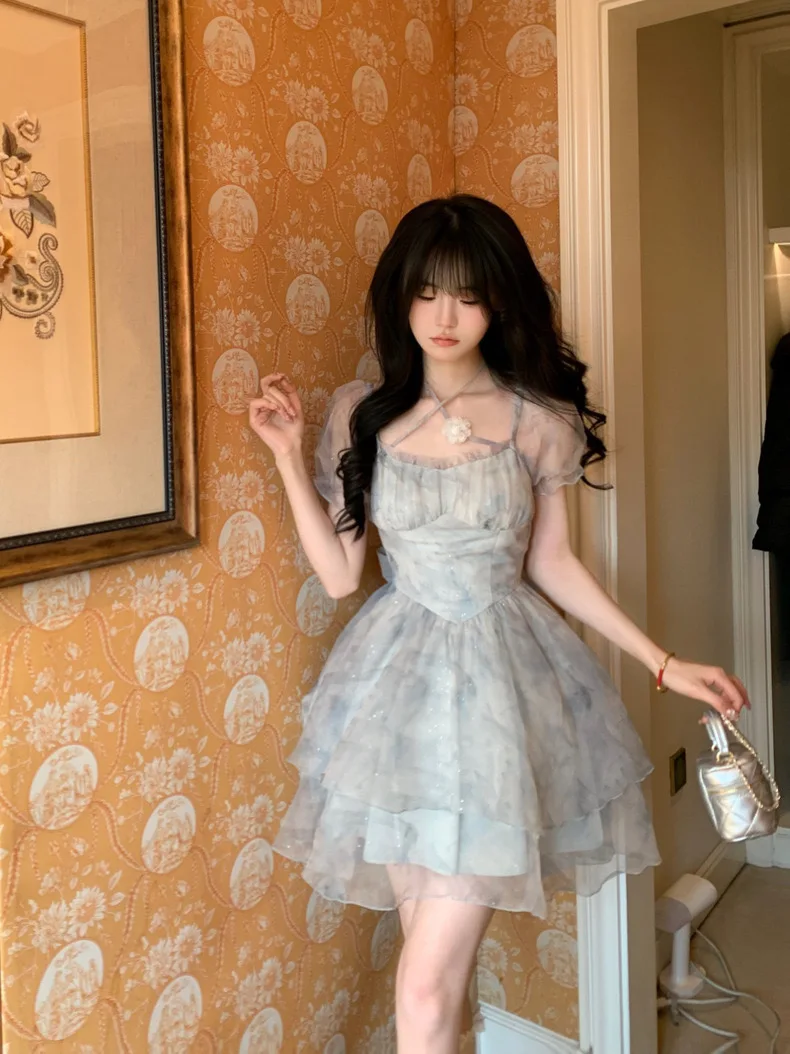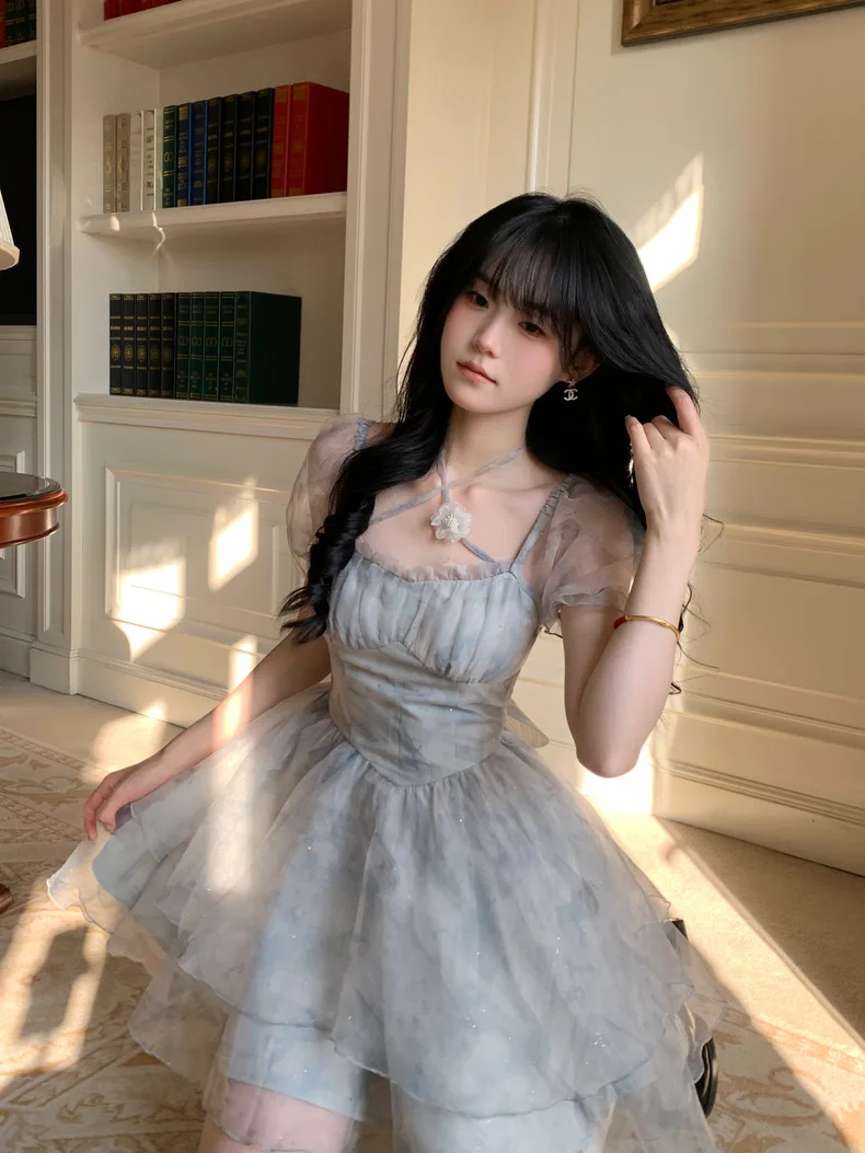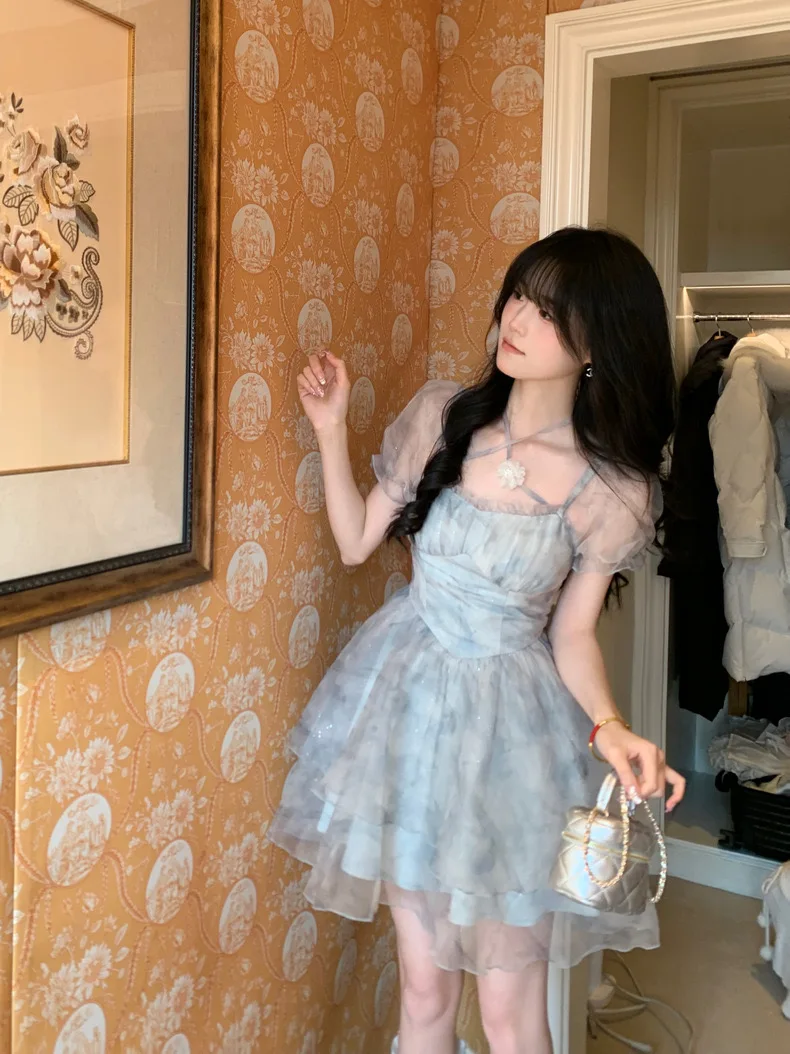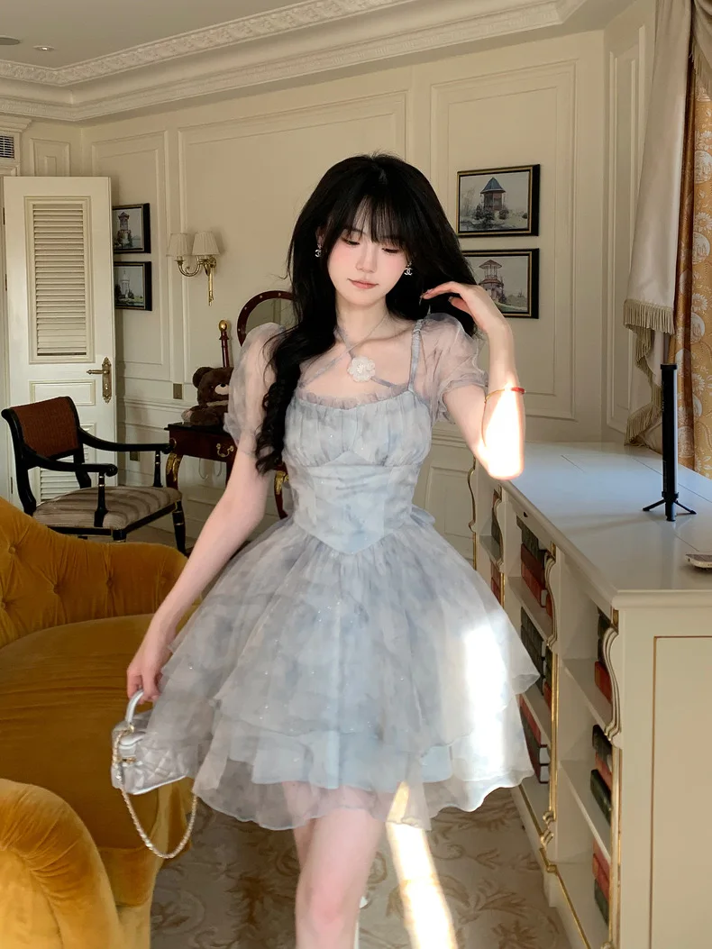 Summer Fashion Dresses 2024 French Elegant Dresses For Women Princess Puff Sleeve Bowknot Dresses Mesh Fantastic Fairy Dress